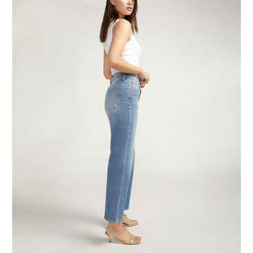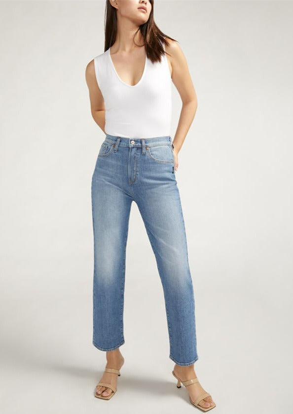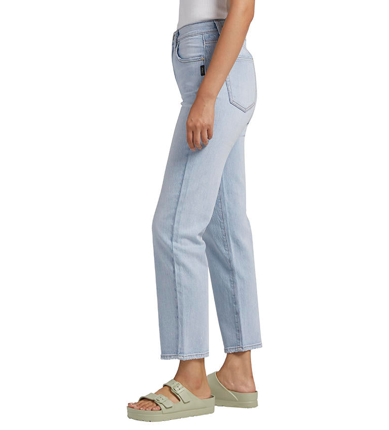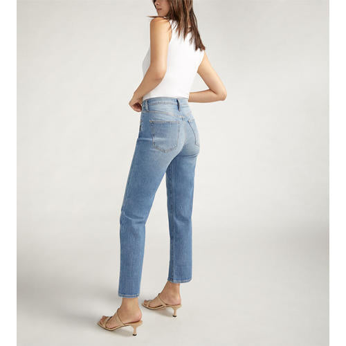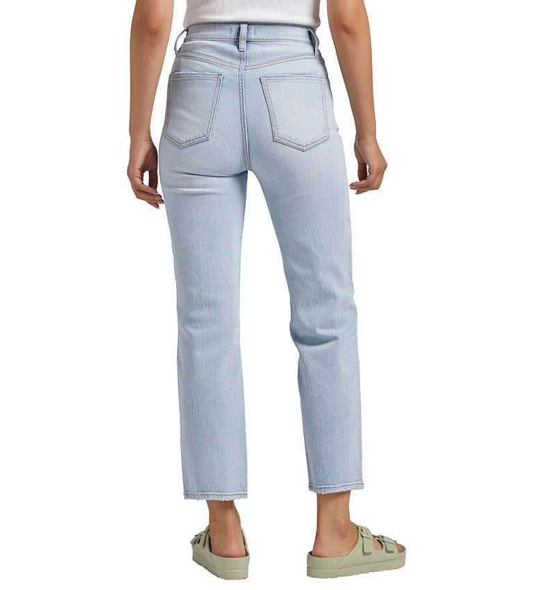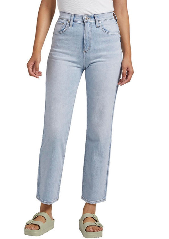 Detail: Straight leg jeans with a light indigo wash. High Rise. Straight. Low Stretch. 5-pocket styling with a zip fly and button closure.