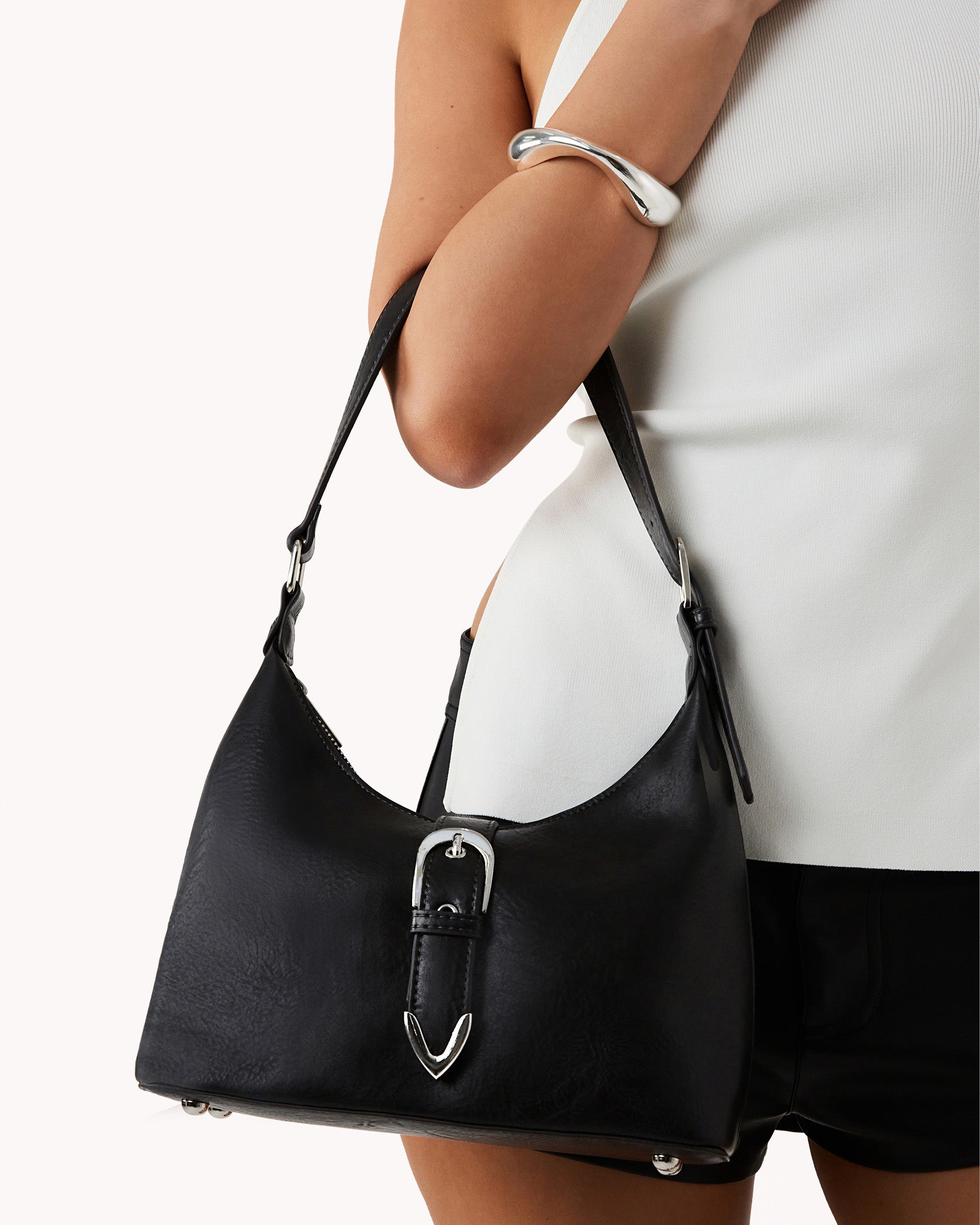 - fixed, adjustable shoulder strap with buckle hardware detailing