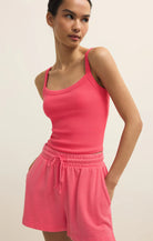 This fitted tank features a shelf bra, spaghetti straps, and a rib blend fabric. Designed to go with any of our activewear styles, it’s as effortless as it is cute.