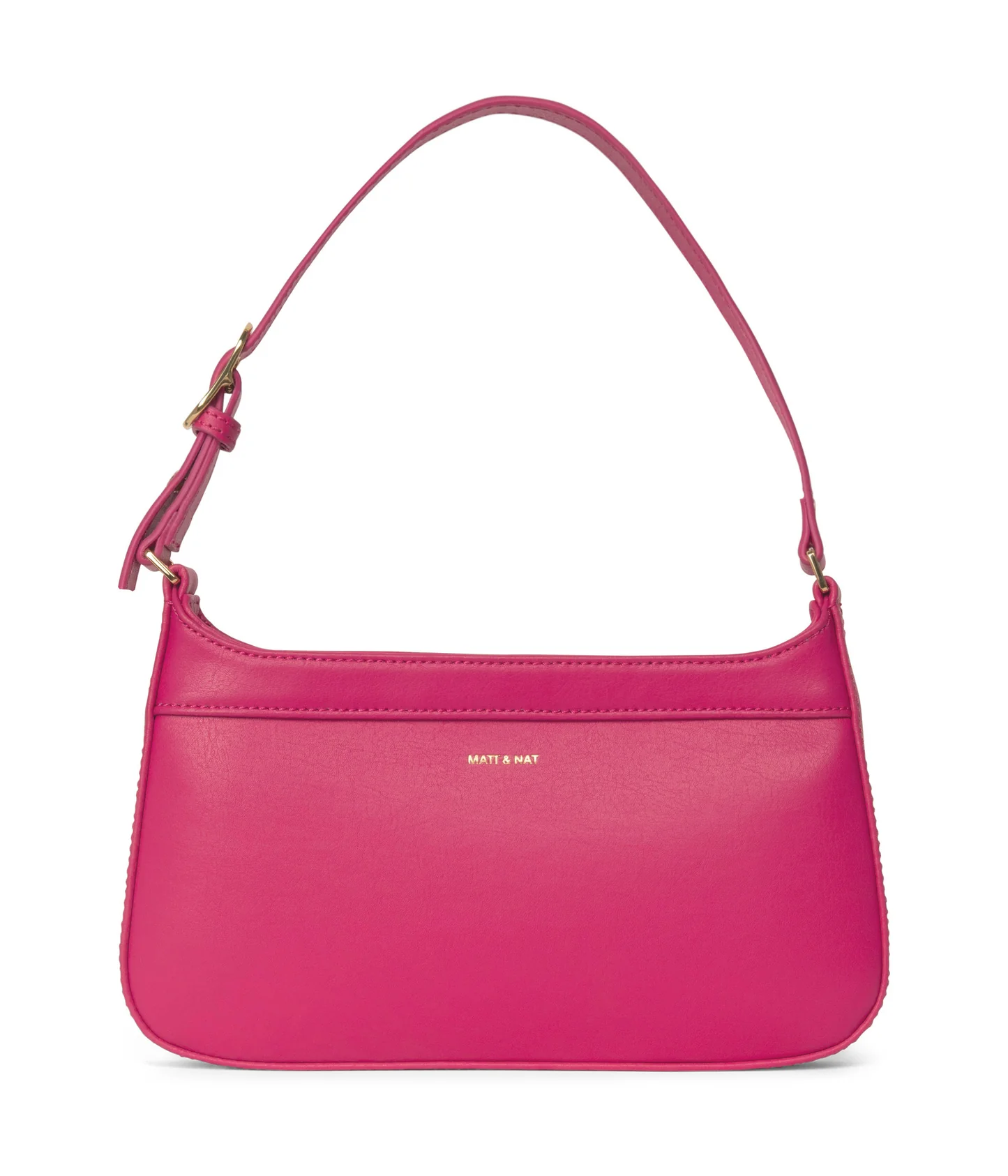 Slim shoulder bag with a top zipper closure and an adjustable buckle strap.
