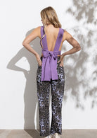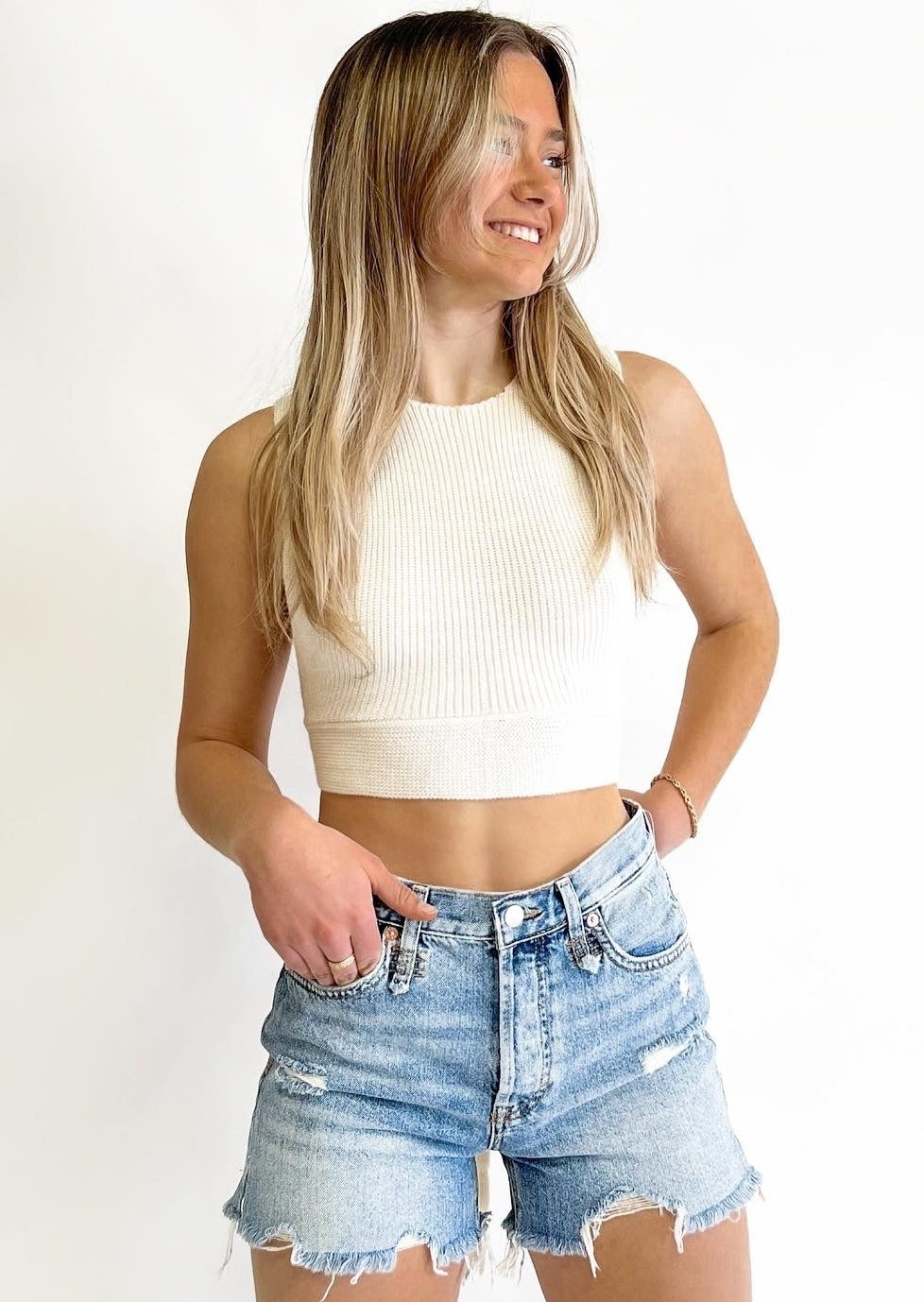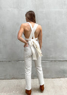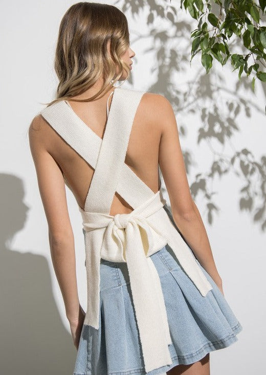 This supremely summery Ganni top is crafted from soft sand coloured fabric in a stretchy ribbed knit. It is sleeveless and cropped, with crossed straps over the back that tie in a bow at the waist.