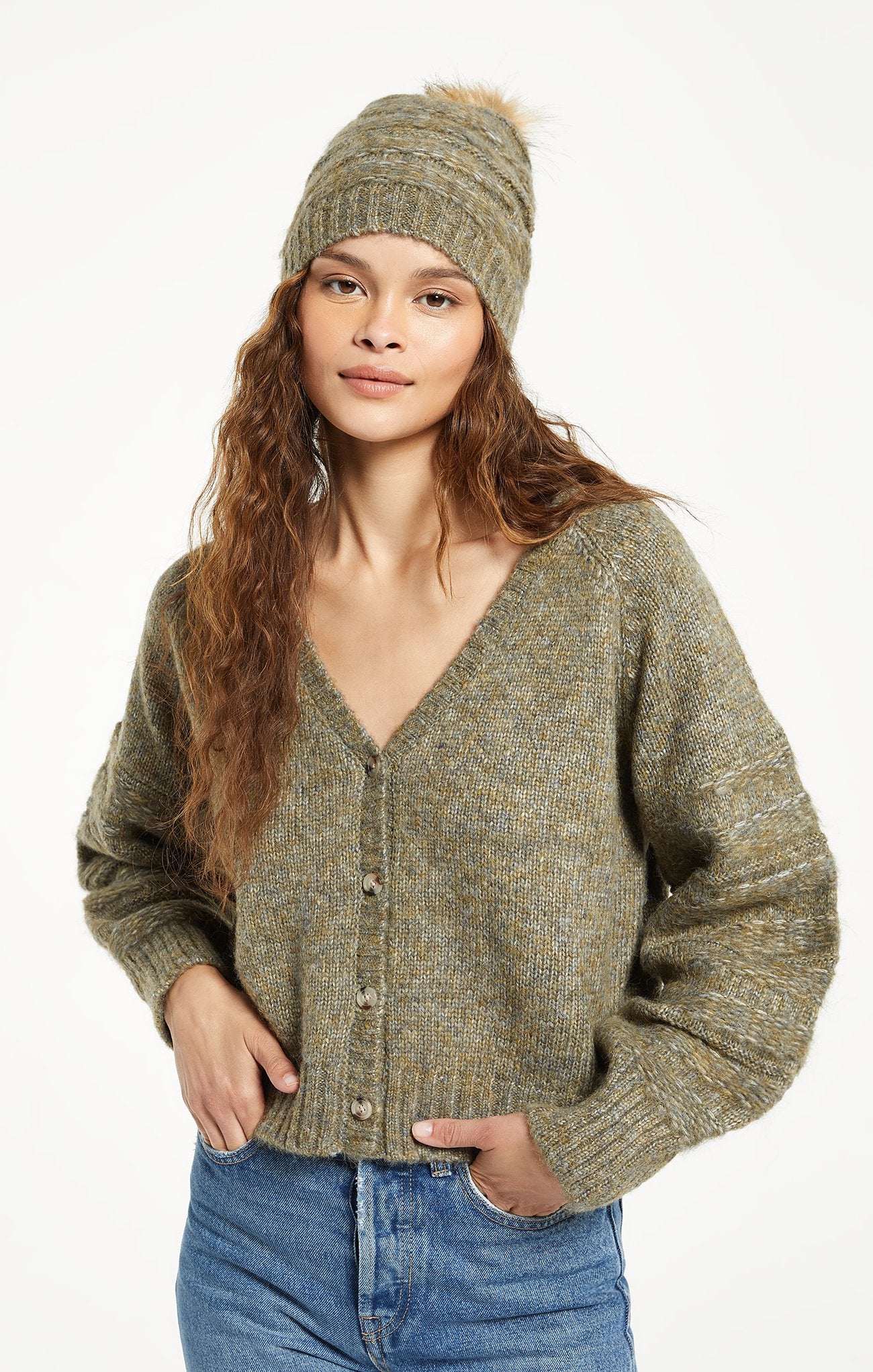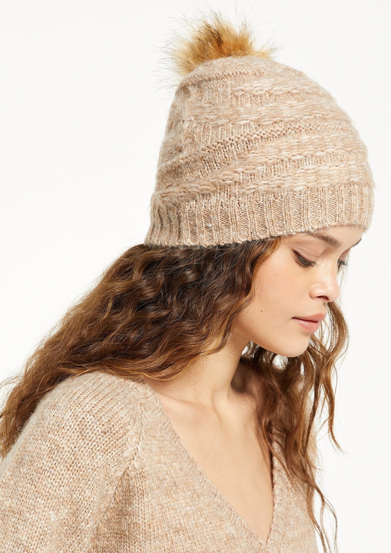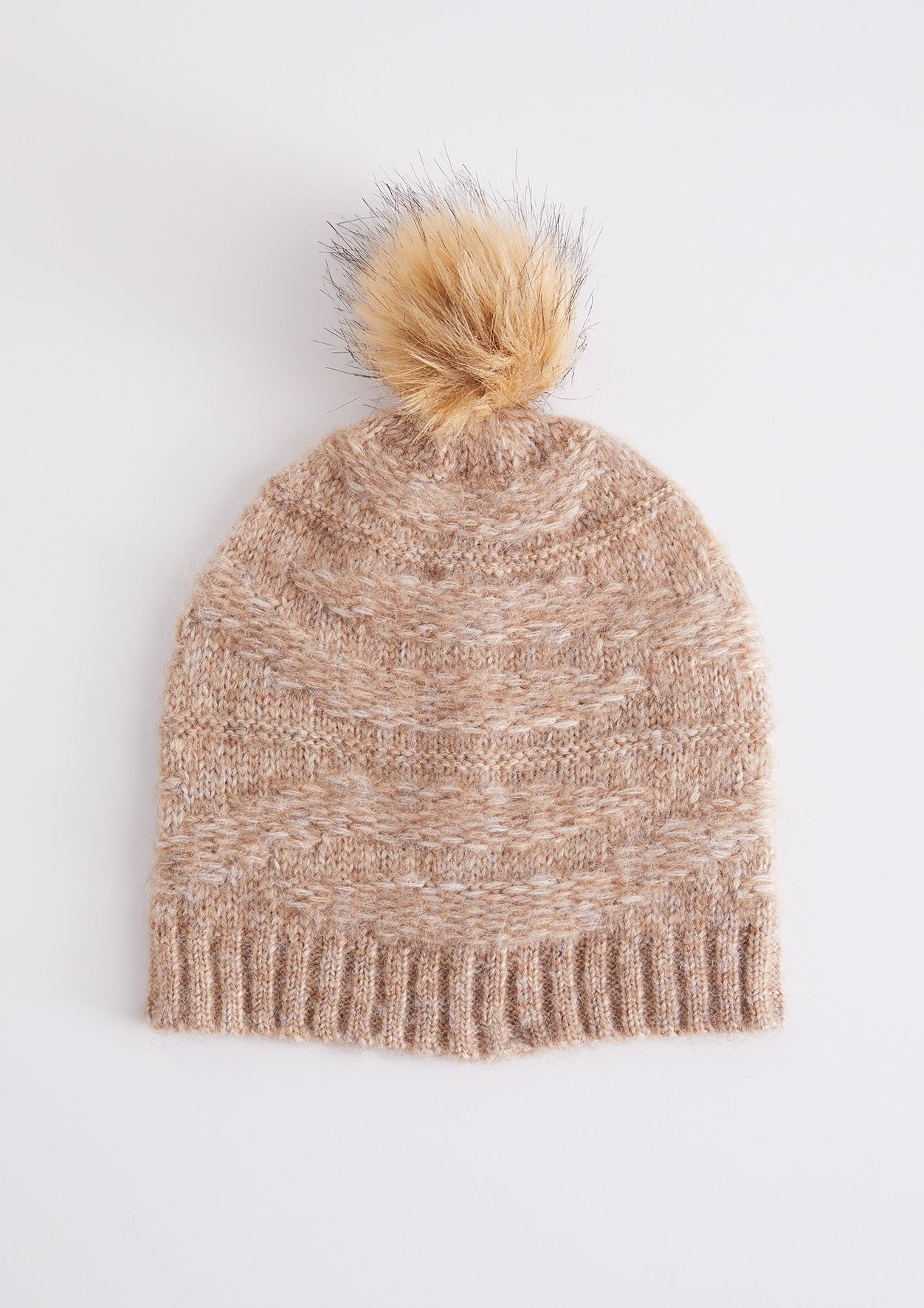 This beanie features a faux fur pom pom and rib start so you can stay warm and cozy in style.