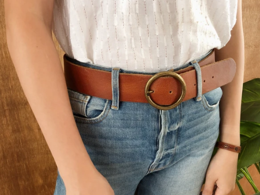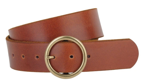 Genuine leather belt with edges tooled in a single horizontal design and trendy double circle buckle.