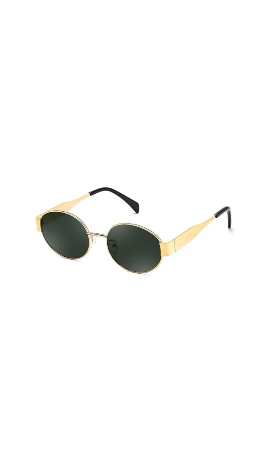 Detail: Oval shape lenses, gold frame with black ear pieces, adjustable nose pieces, black tinted lenses.