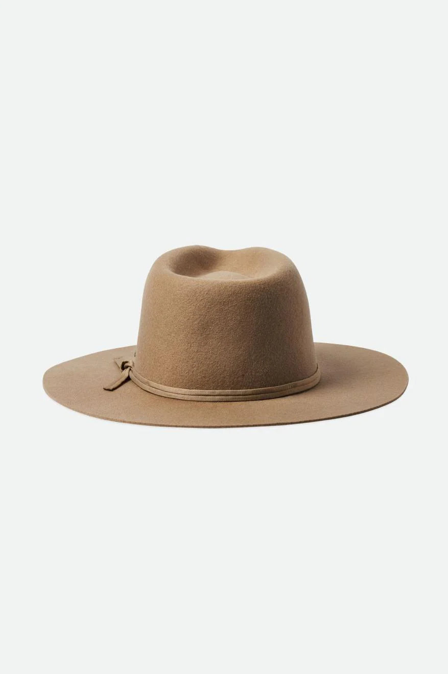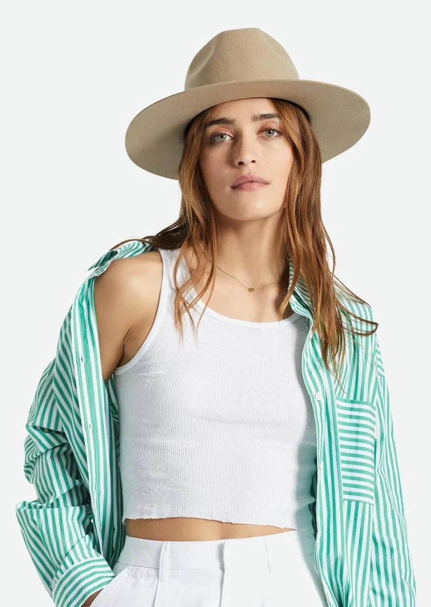 A structured wide-brim hat with a raw edge. Made from certified cruelty-free wool that meets the Responsible Wool Standard for Sustainability. Find your perfect fit with the adjustable interior sweatband. It's finished with a thin grosgrain band and a metal Brixton pin.