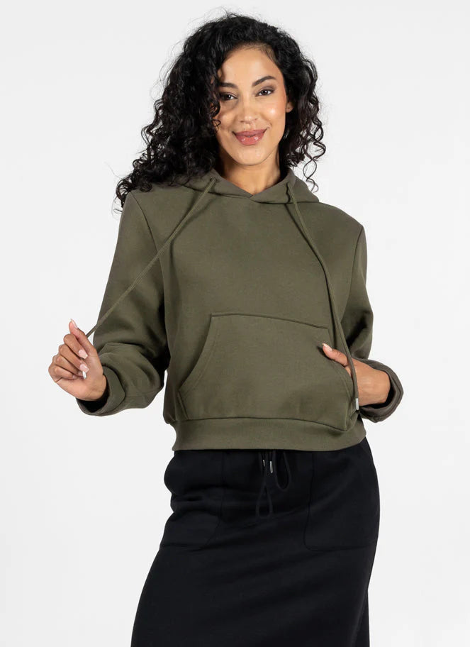 Recycled polyester cotton fleece hooded jacket with a front pocket and drawstring hood.
