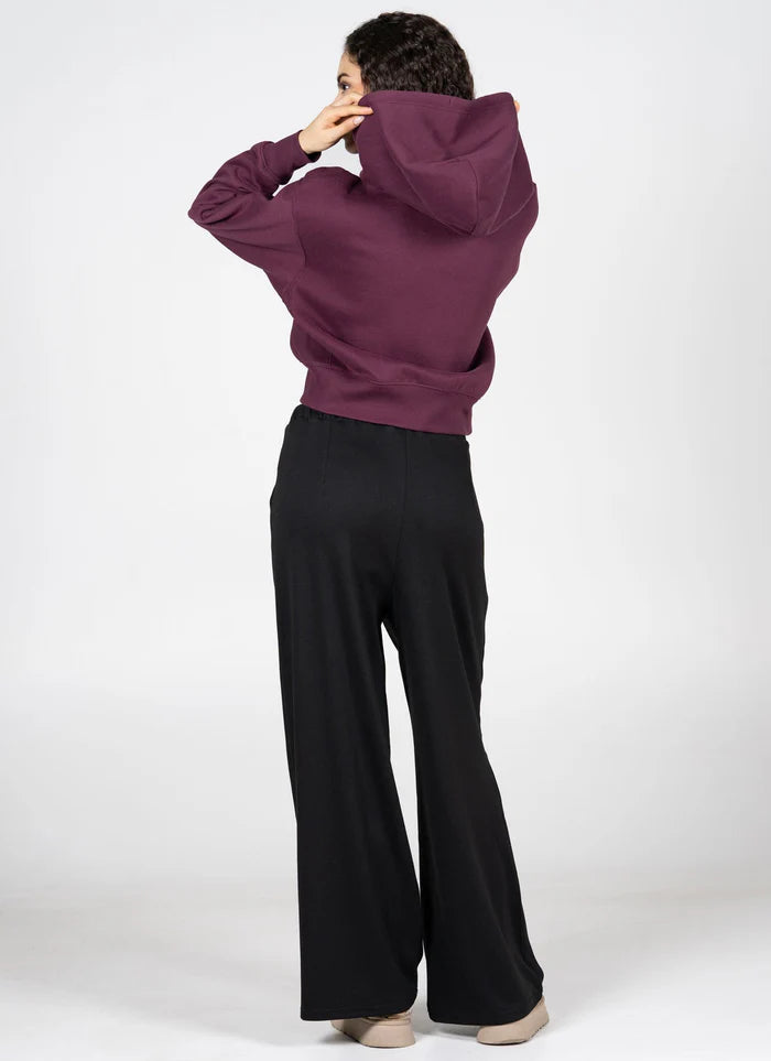 A double waist pleated front, drawstring pant featuring pockets on the side.