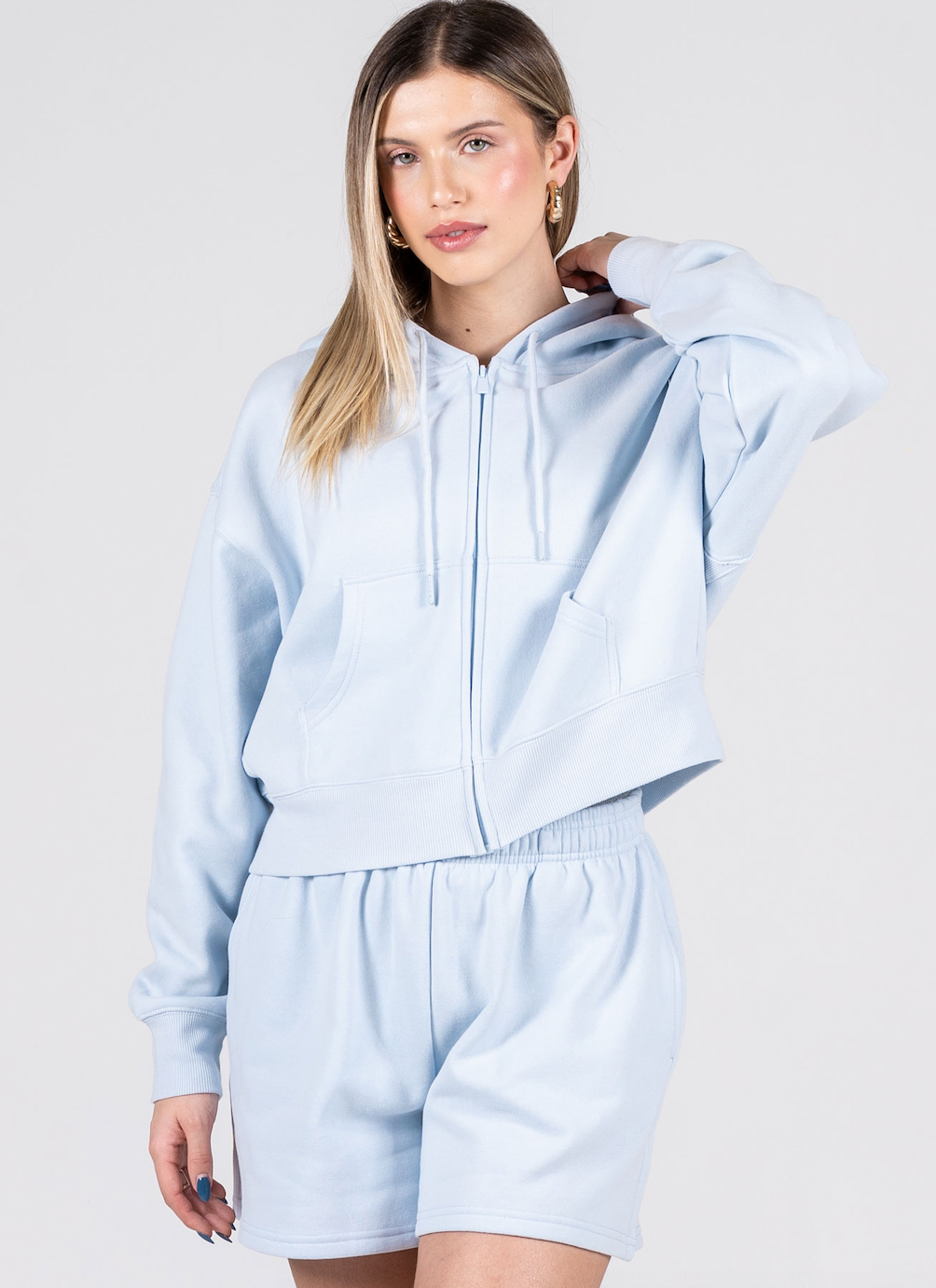 Recycled polyester cotton fleece hooded jacket with a front pocket and drawstring hood.