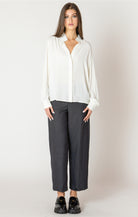 Details: Charcoal pant, white pin stripes, single outside waist button and single inside waist button, zipper fly, two functional front pockets, functional belt loops, elastic back waistband, two back faux pockets, adjustable button hem on bottom of pant legs.