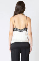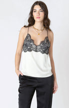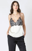 Slip into the Dex Lace Trim Cami, where delicate black lace meets soft ecru satin for a look that's effortlessly flirty. Adjustable straps ensure a perfect fit, letting you feel confident and comfortable all day or night. Perfect for layering or wearing on its own, this cami adds a touch of playful elegance to your wardrobe.