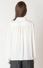 Details: Flowy blouse, off white, collar neckline, button front, single button cuffs, subtle pleating around cuff and on shoulder,
