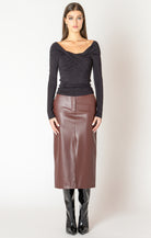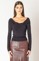 Details: Black long sleeve, crossover detail on front and back, off shoulder.