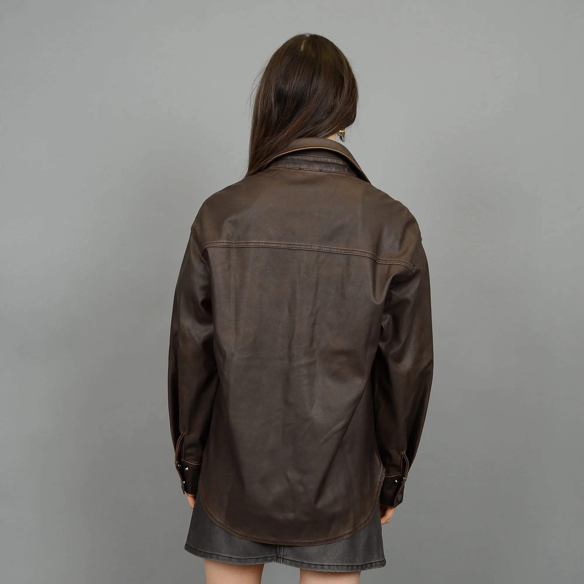 Aliska Distressed Faux Leather Snap Front Shirt | Cedar Brown