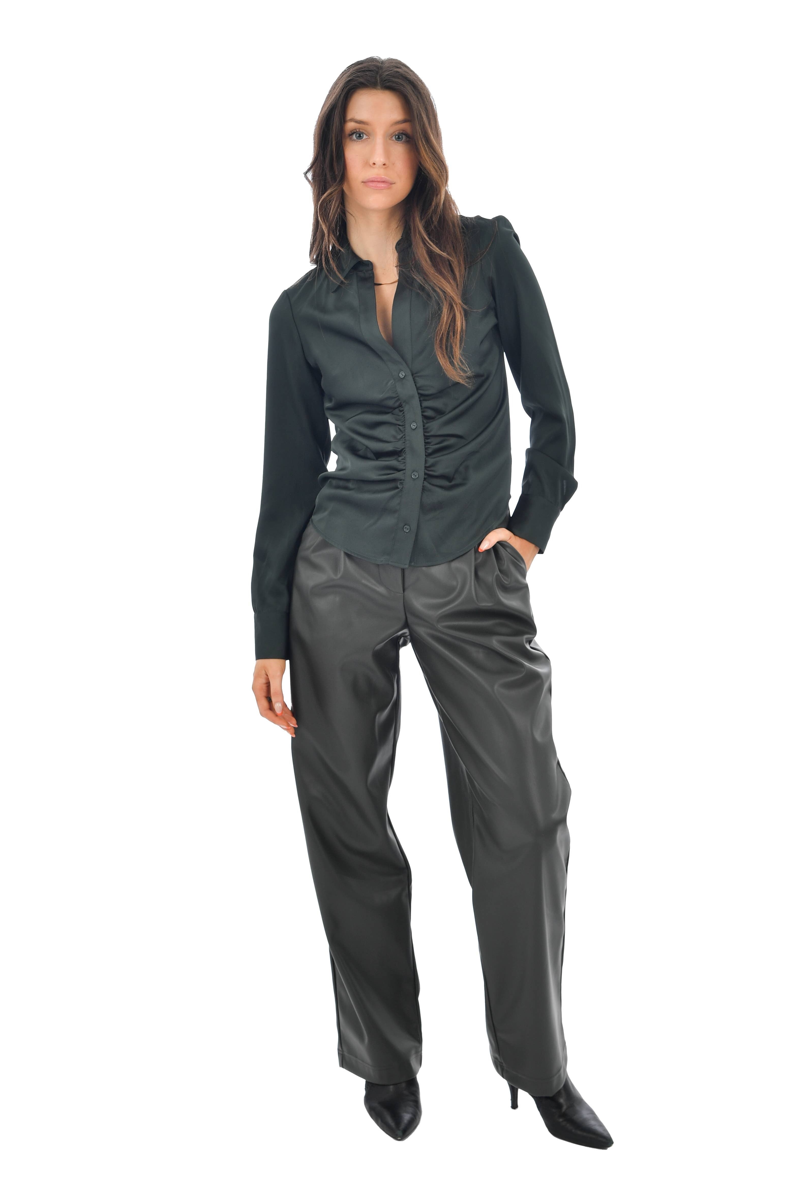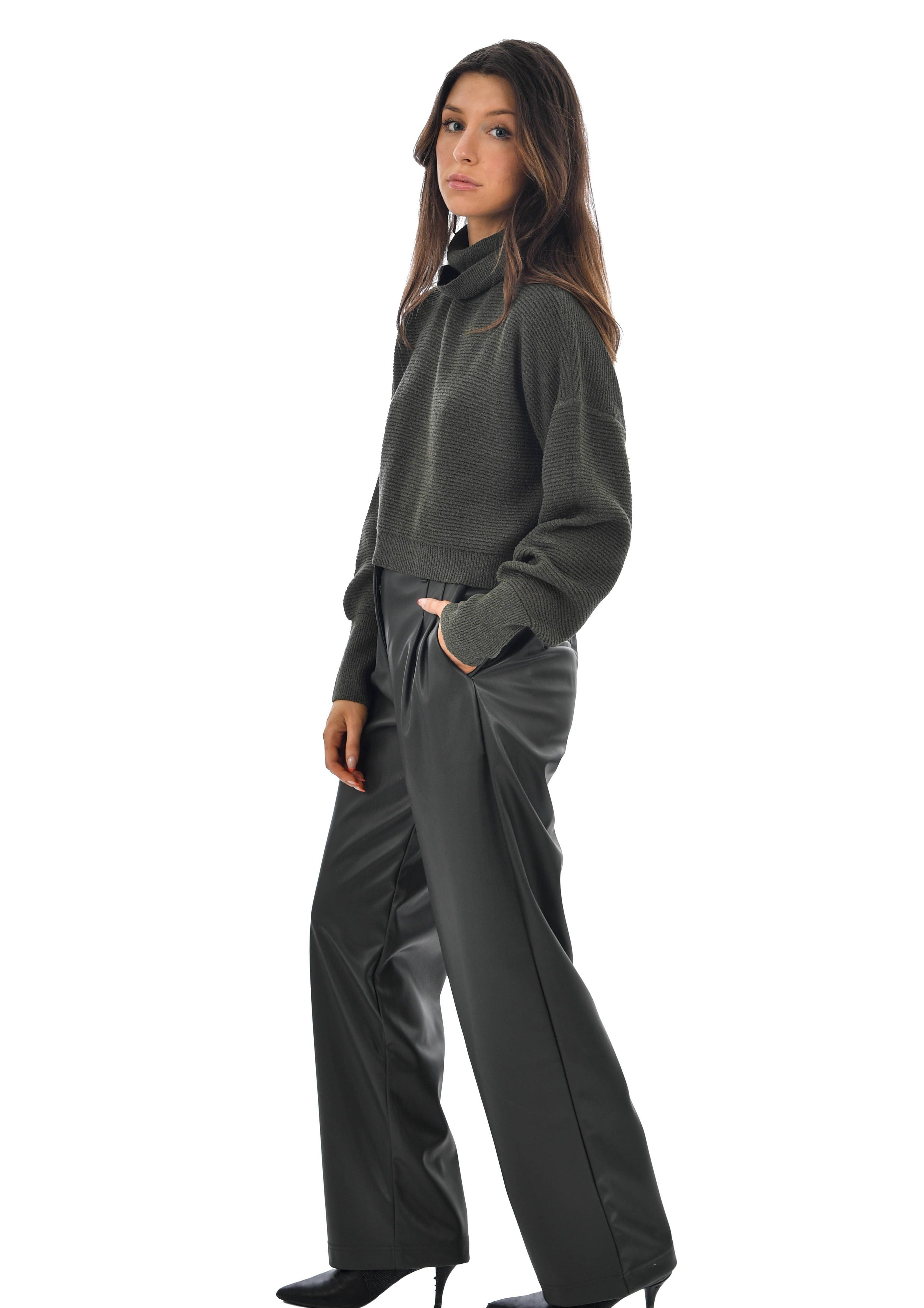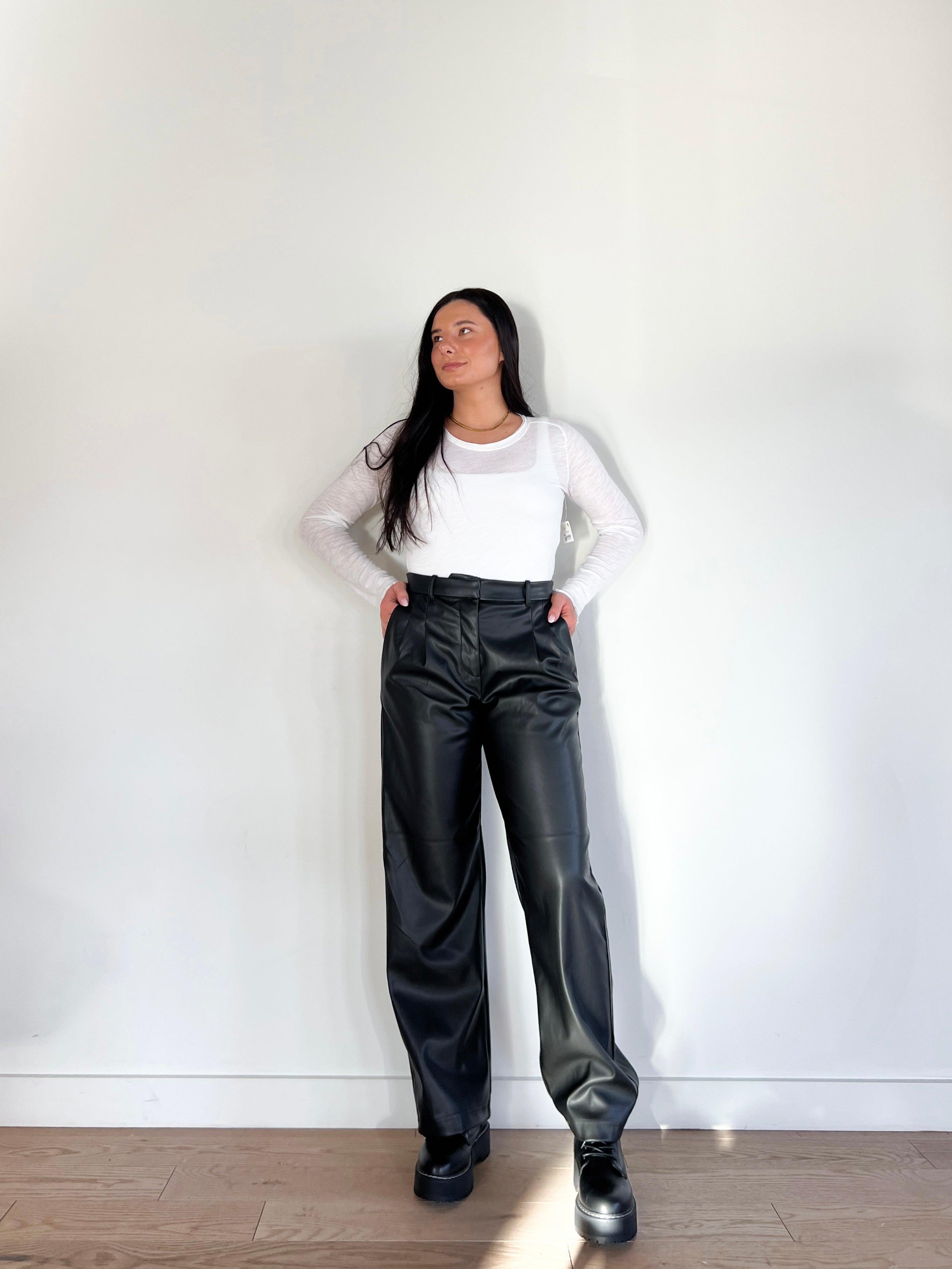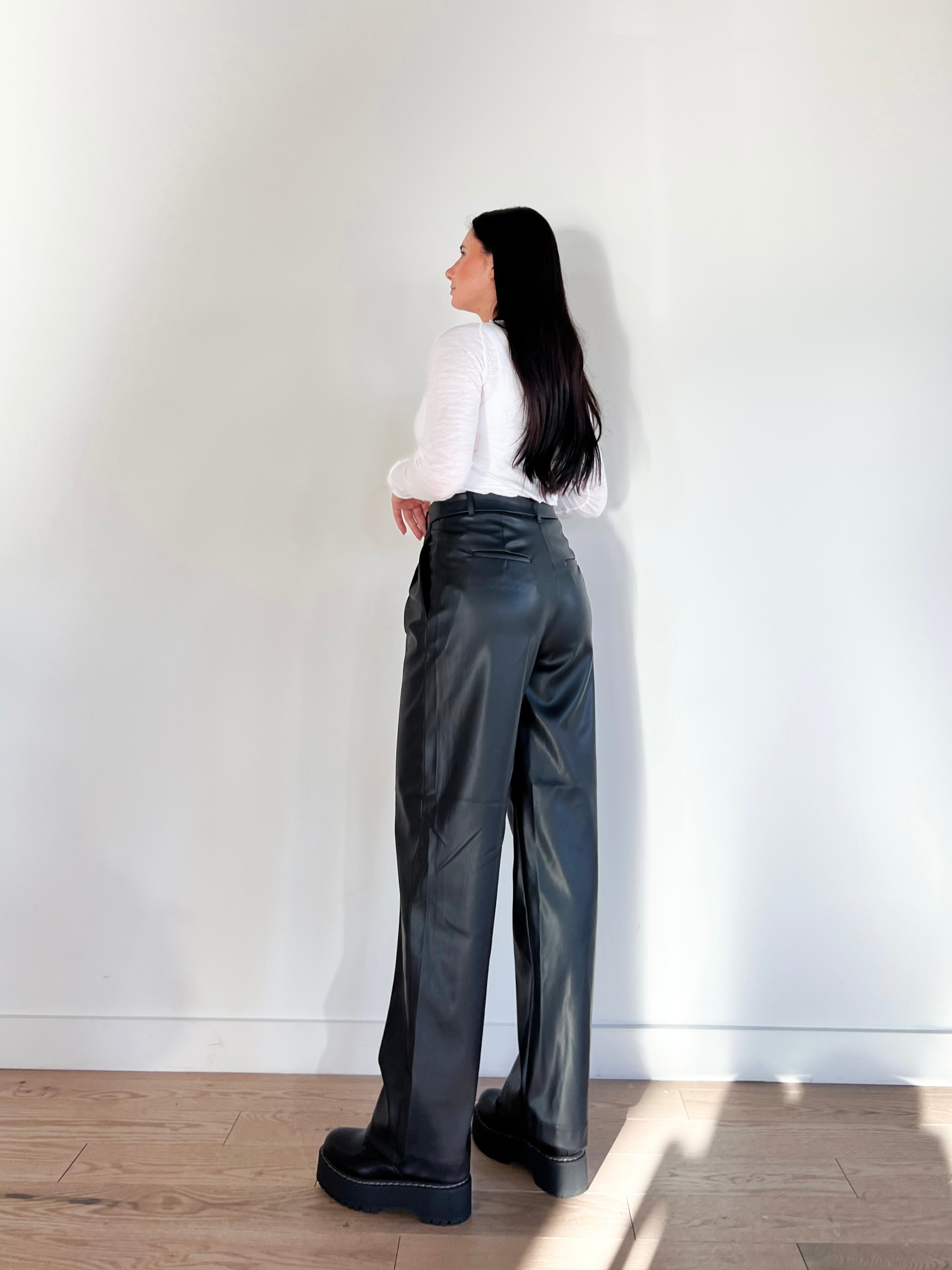 These are mid-rise trousers with slash hand pockets, back welt pockets and a darted back waist for shaping. They’re made with our innovative Vegan Leather that looks and feels like the real thing.