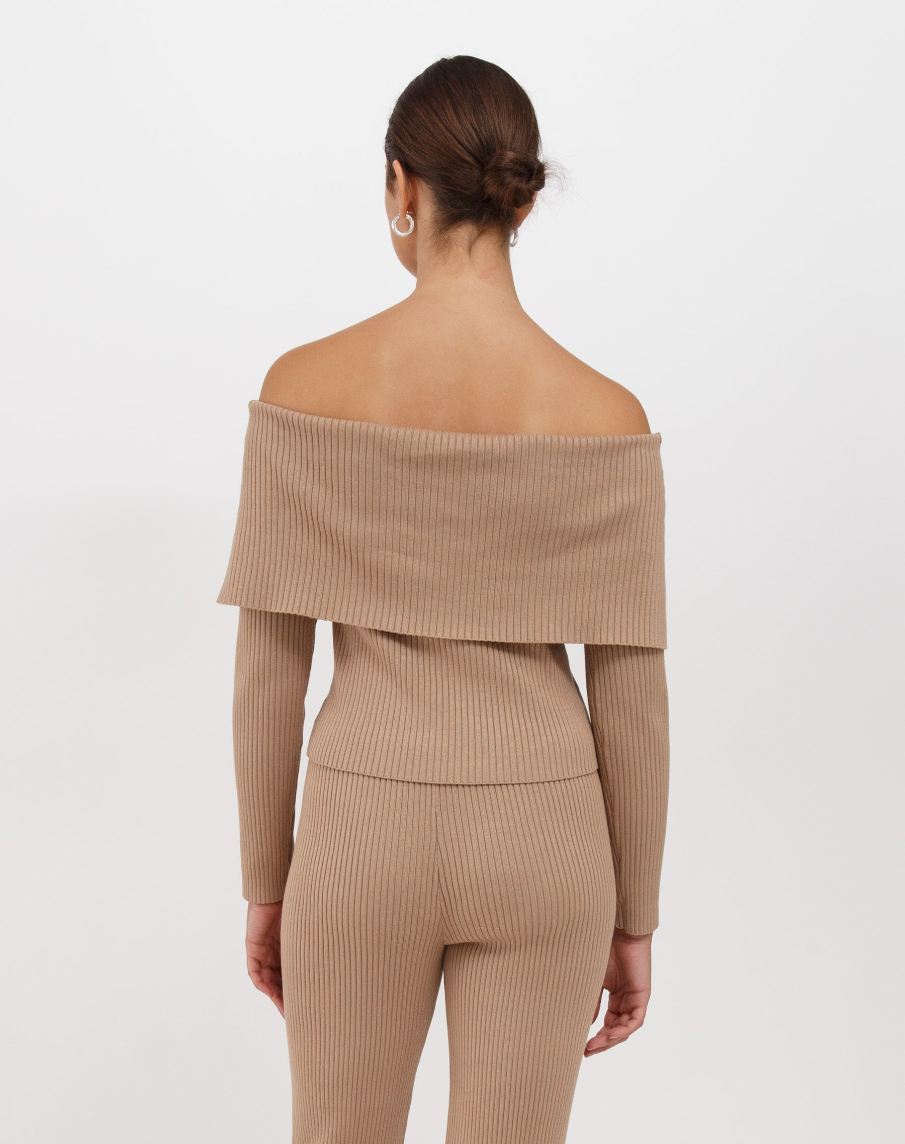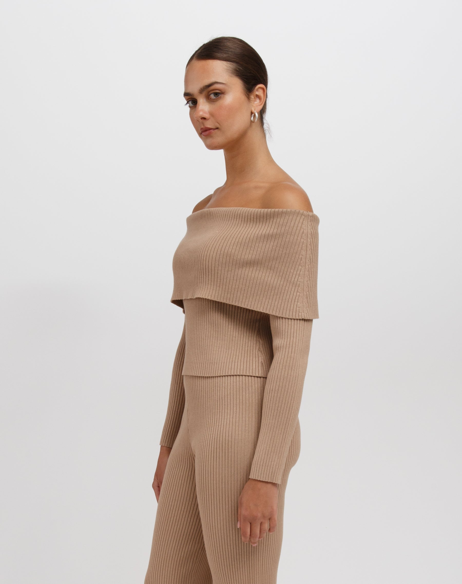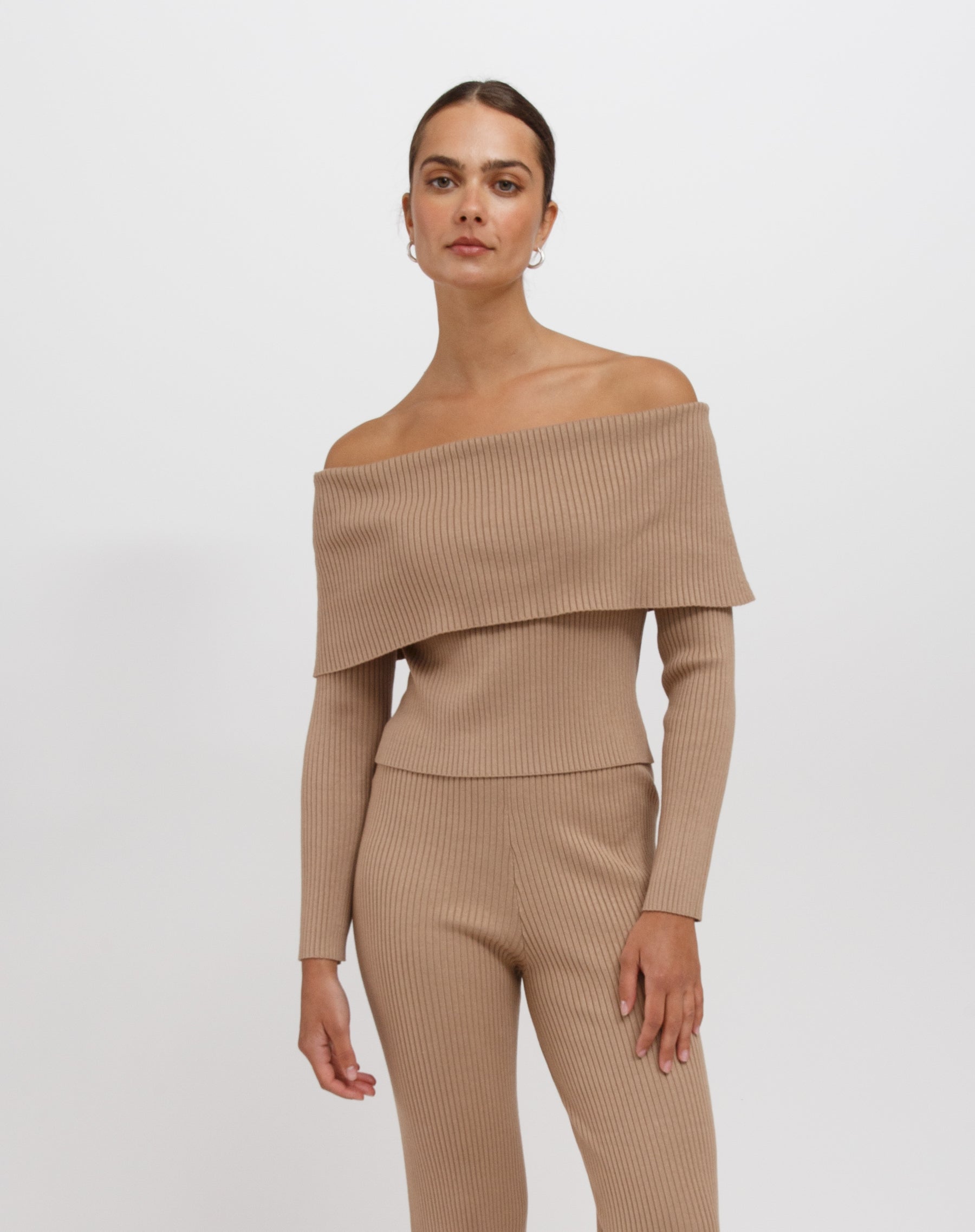 Elle Rib Knit Off the Shoulder Sweater | Fawn