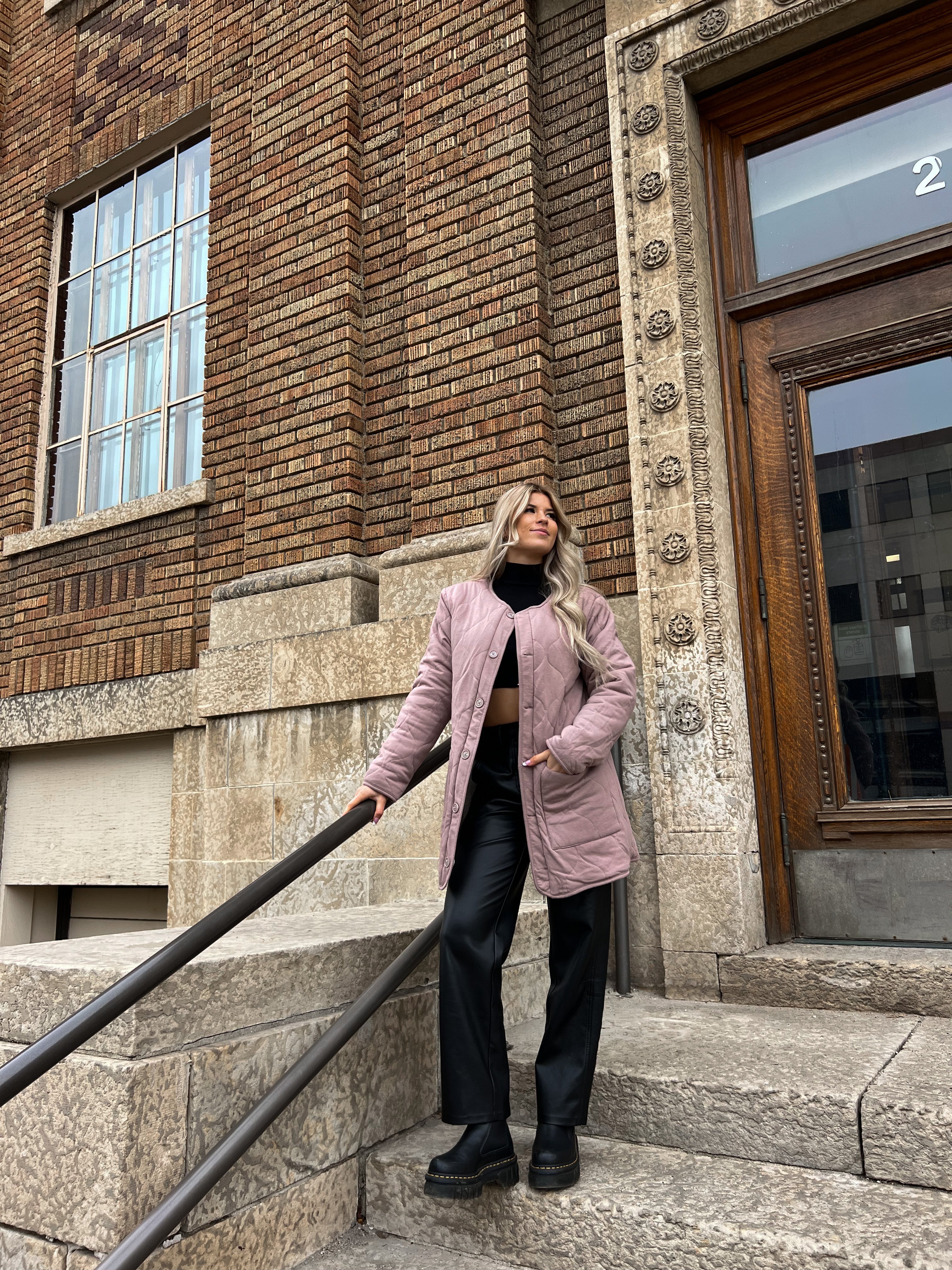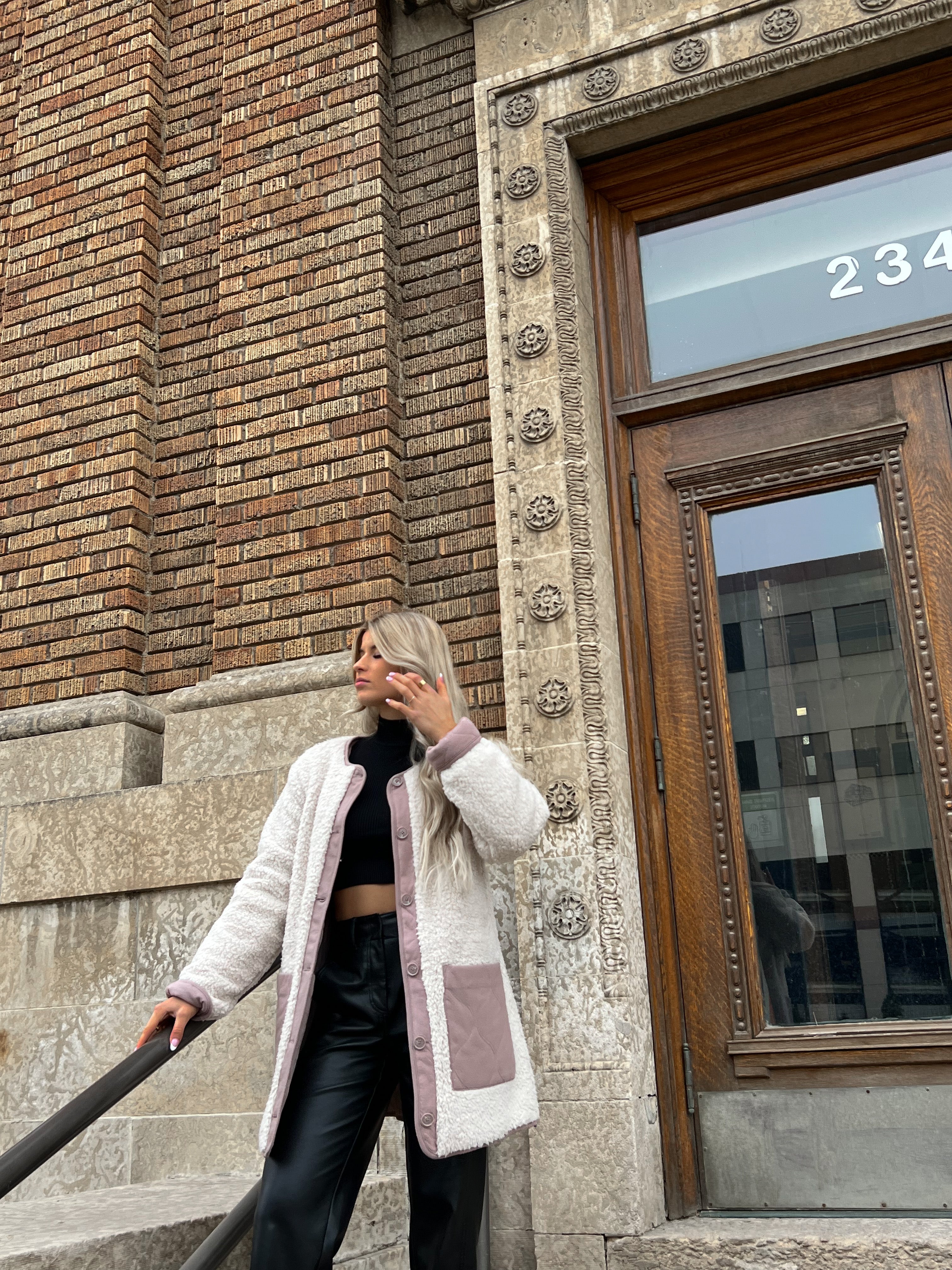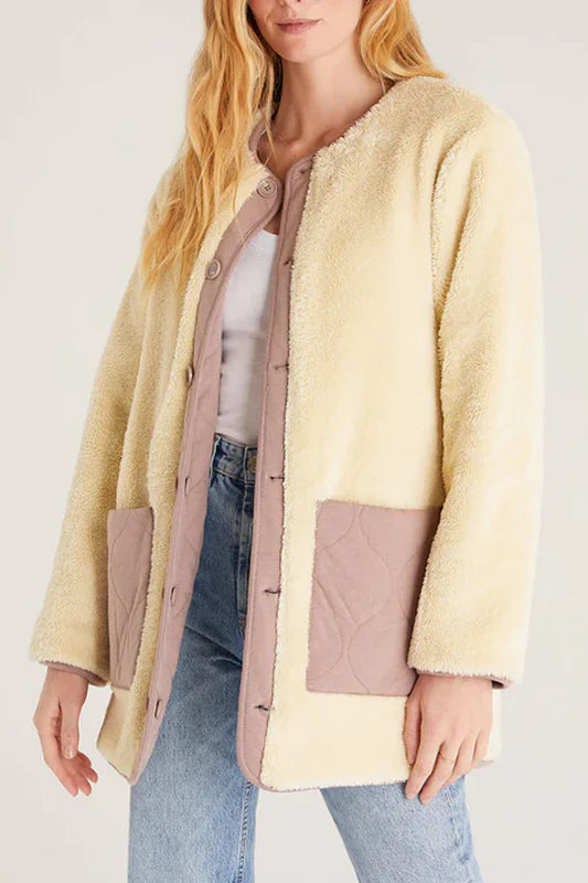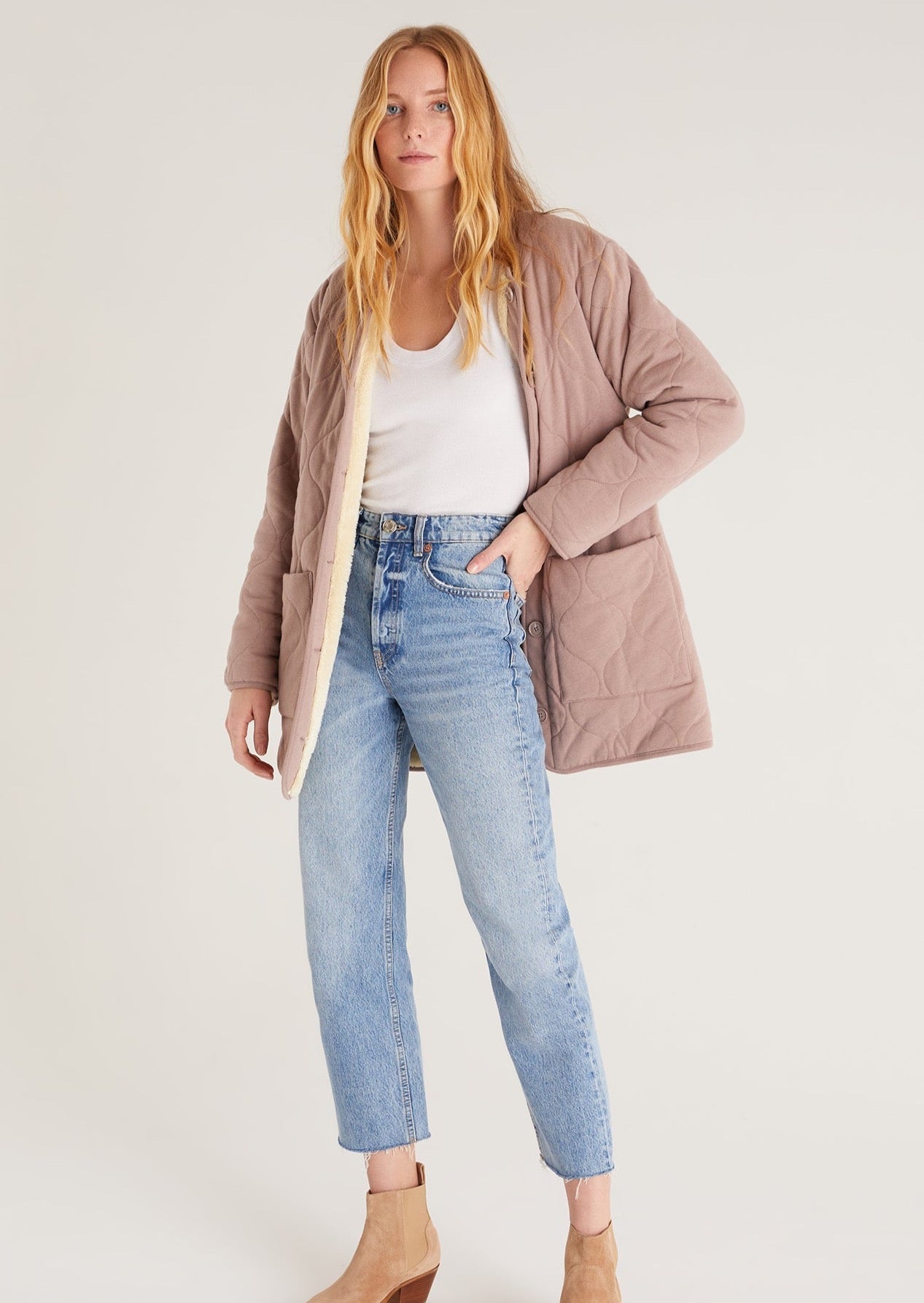 With cozy sherpa on one side and a soft jersey quilted design on the other, this reversible Rana Quilted Reversible Sherpa Jacket offers style and cozy warmth any way you wear it. A fashion must-have this season.