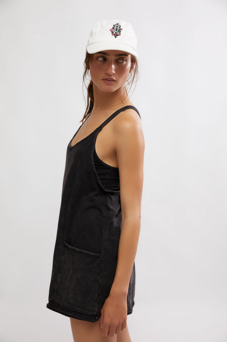 Features: Soft fabrication, lightweight design, scoop-neckline, thin shoulder straps, racerback detail with zippered pocket, oversized patch pockets at front, lined interior with shorts piecing at bottom