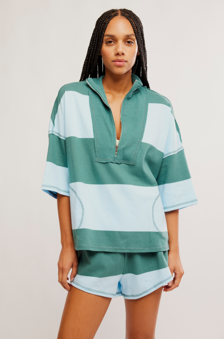 Features: Top: Front quarter-zip closure, striped pattern throughout, dropped shoulder seams, side pockets; Shorts: Pull-on design, coordinating print.