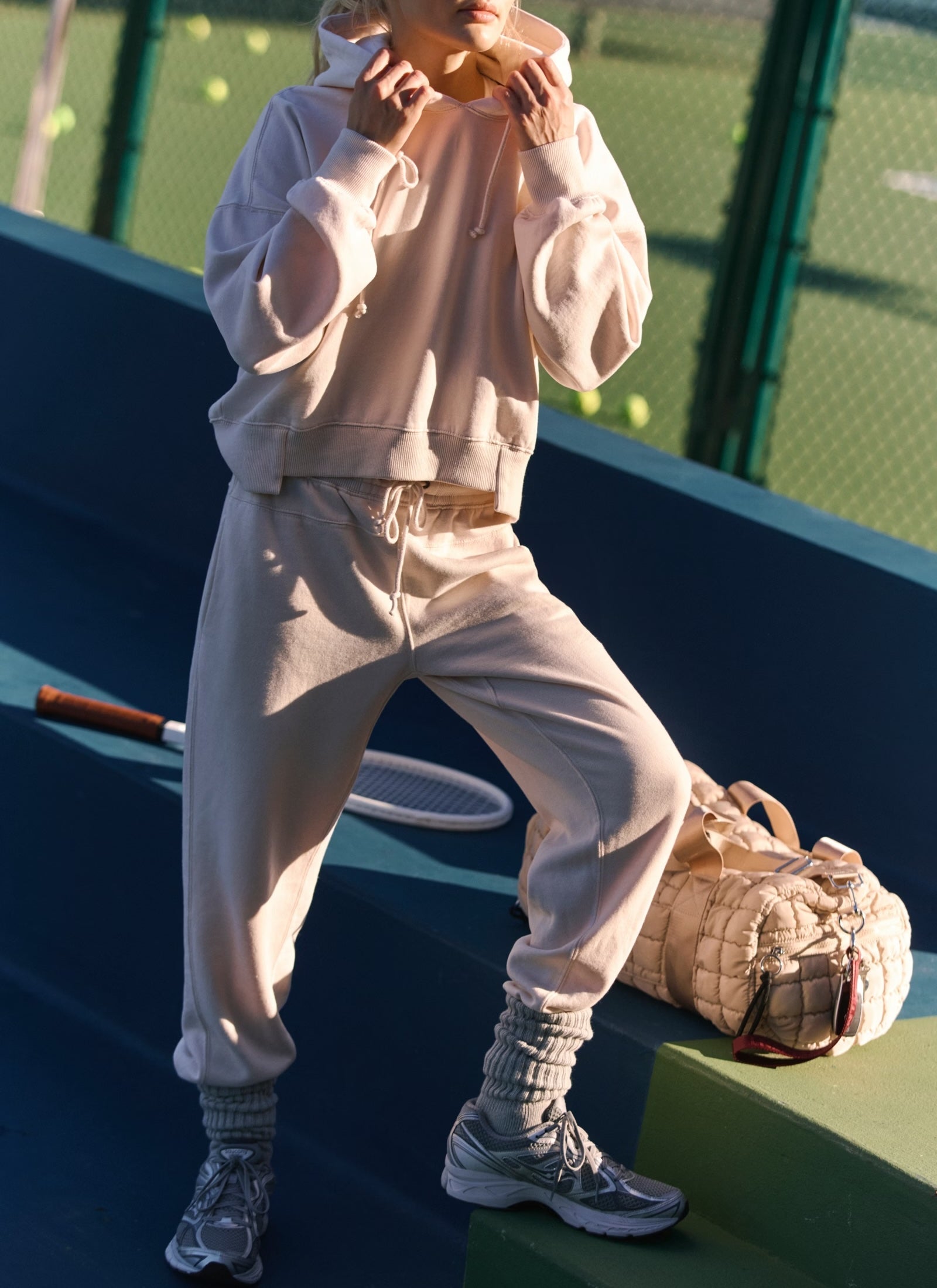Features: Classic hood; dropped shoulders; elasticated hems; lower back hem; high-rise pants; drawstring waistline; elasticated ankle cuffs