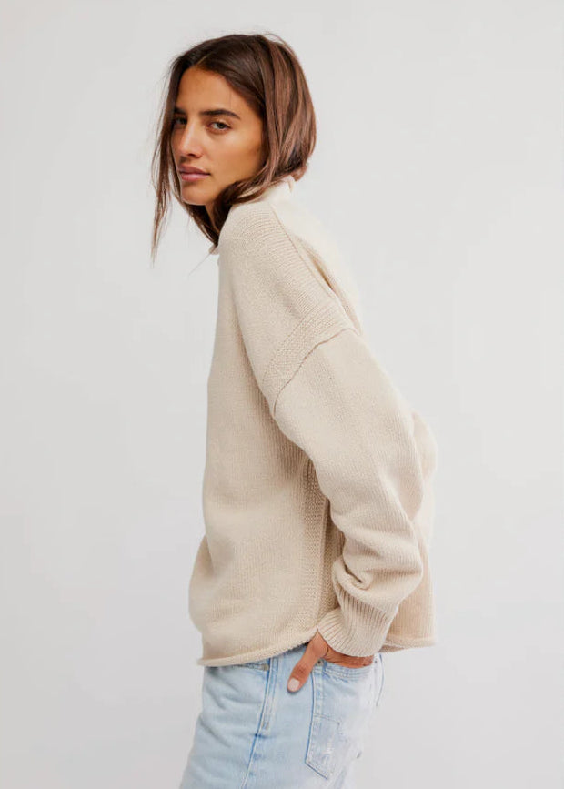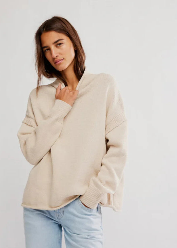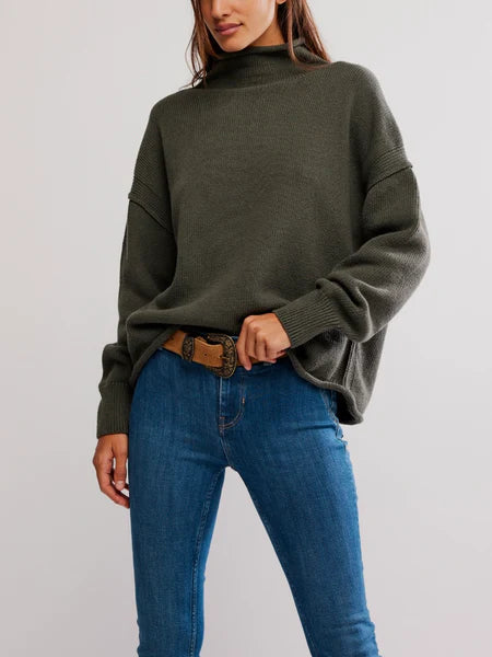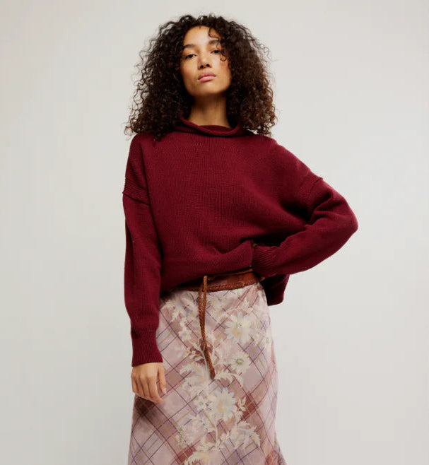 Featured in a soft, knit fabrication with a mock neckline and dropped shoulders for that slouchy, laid-back feel. Designed with an easy silhouette you can wear tucked, layered, or all on its own.
