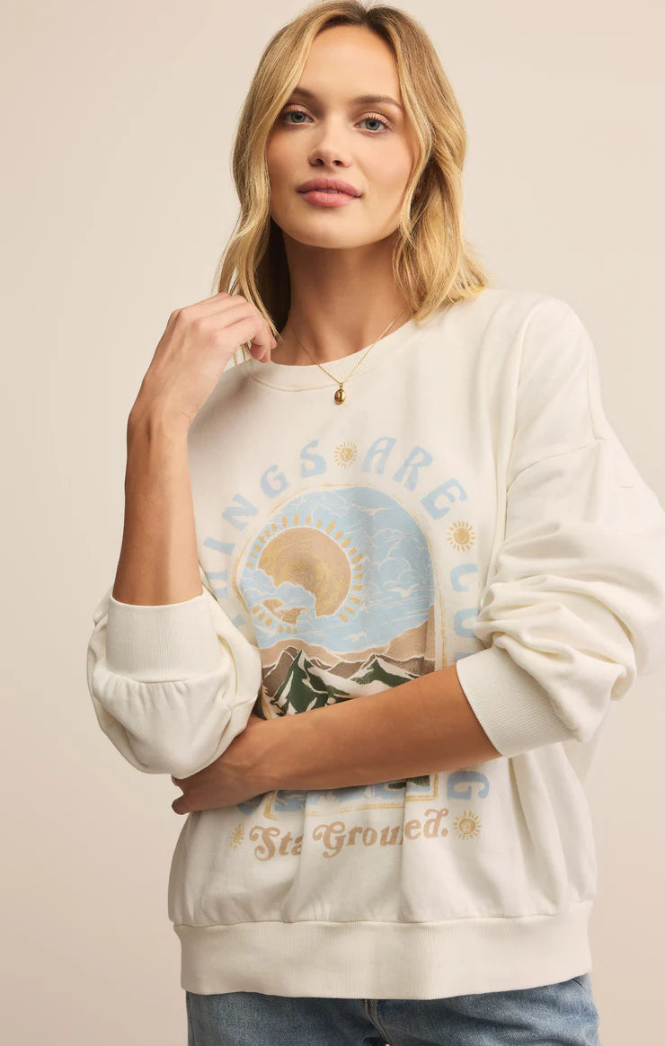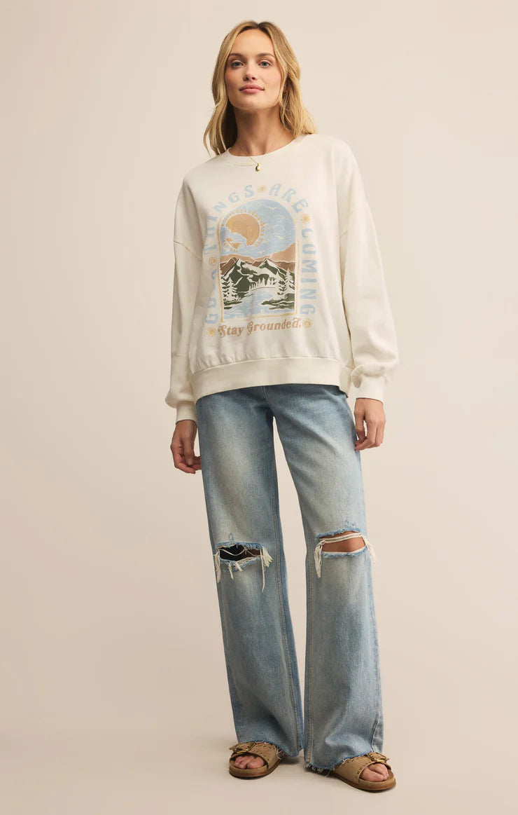 Bring on the good vibes in this cozy oversized sweatshirt, featuring a “Good Things Are Coming” screen print and scenic mountain-lake graphic. Made from ultra-soft brushed cotton fleece, it’s the kind of easy layer you’ll want to live in all season.