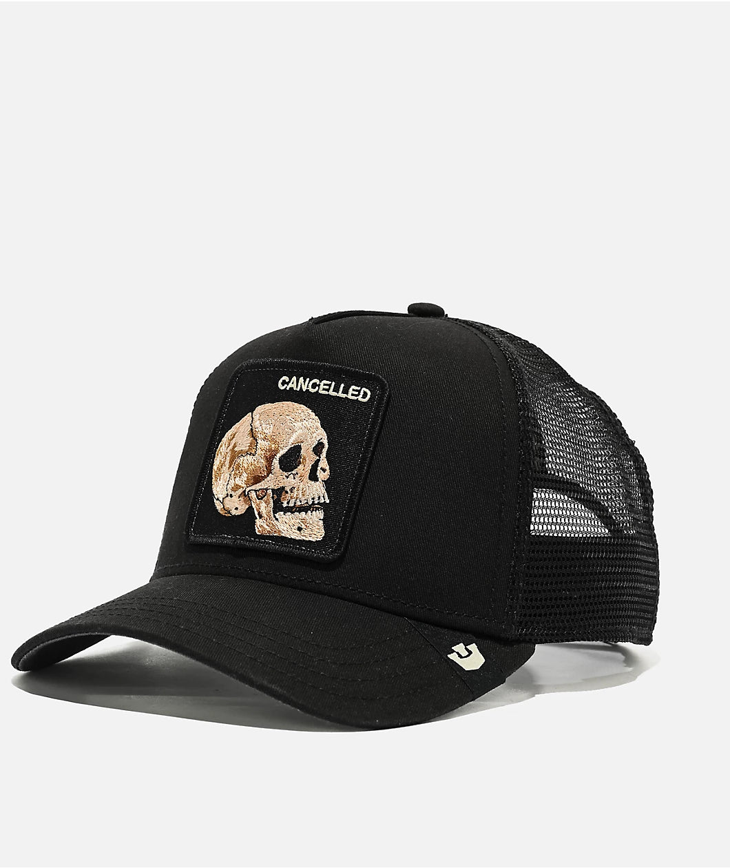 From Goorin Bros. comes the Cancelled Skull trucker hat in a black colorway. The crown of the trucker hat showcases a patch of a Skull that reads "Cancelled" for an edgy, carefree vibe. While the slightly curved brim has a woven brand label, the back of the hat has an embossed branded snapback sizing piece for a custom fit.