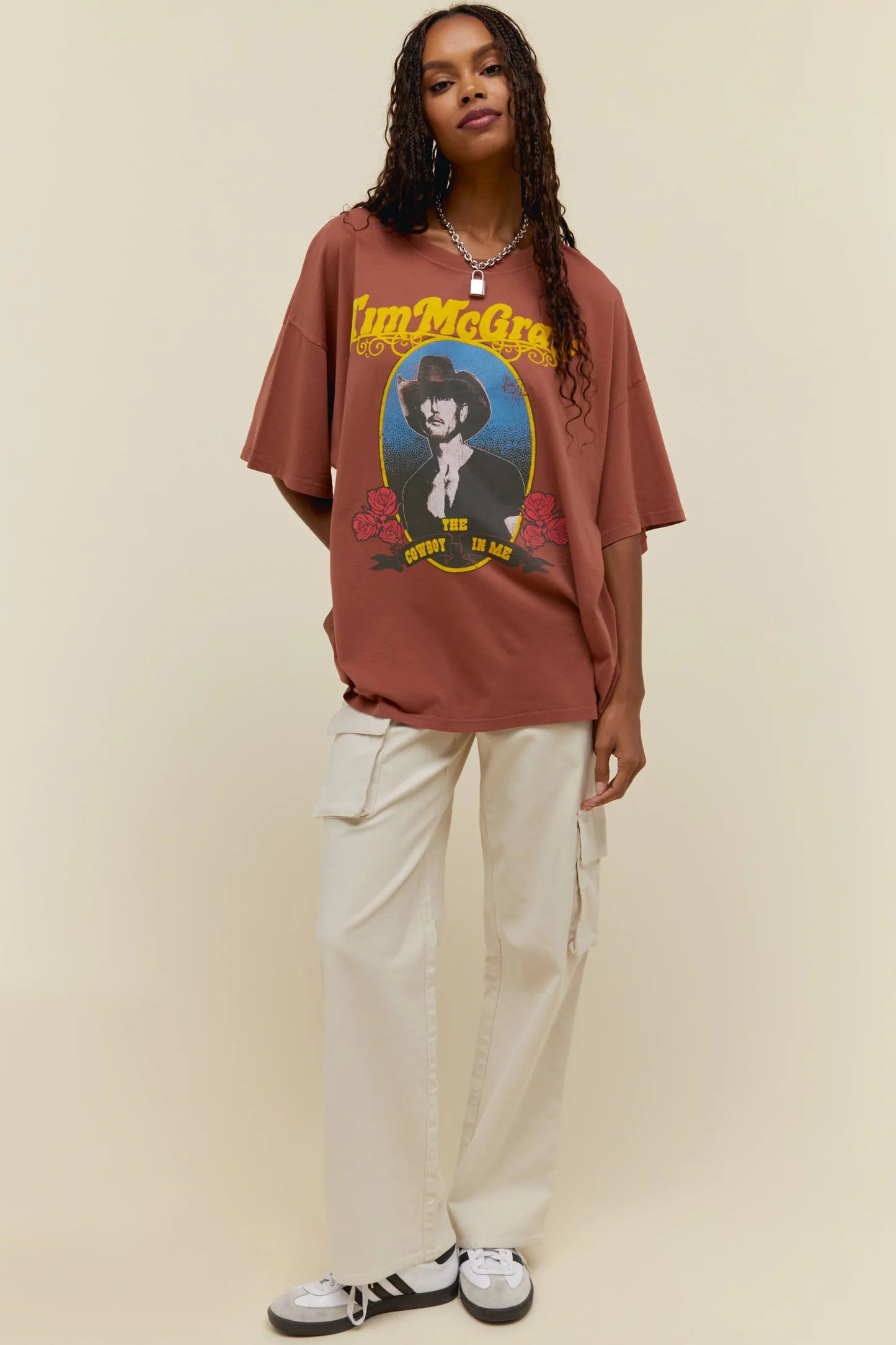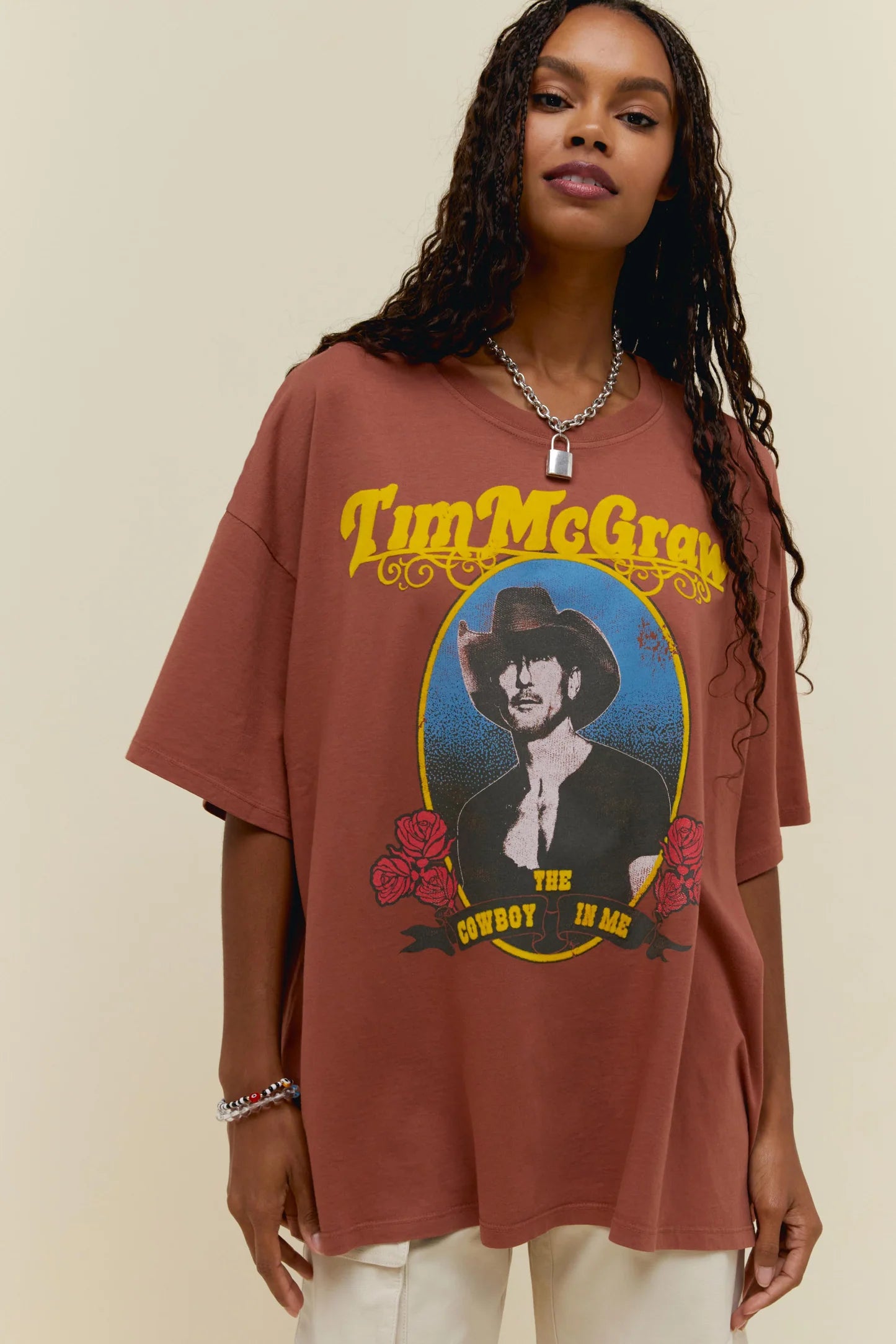 Give it up for Tim McGraw, the living legend responsible for dropping 16 studio albums and leading the country charts time and time again with the perfect mix of heartfelt lyrics and Southern twang. A proven portrait of the country star is now reissued on the fan favorite OS tee featuring his no. 1 on the Hot Country Songs, “The Cowboy in Me.” Designed with the legend’s name in yellow flock.