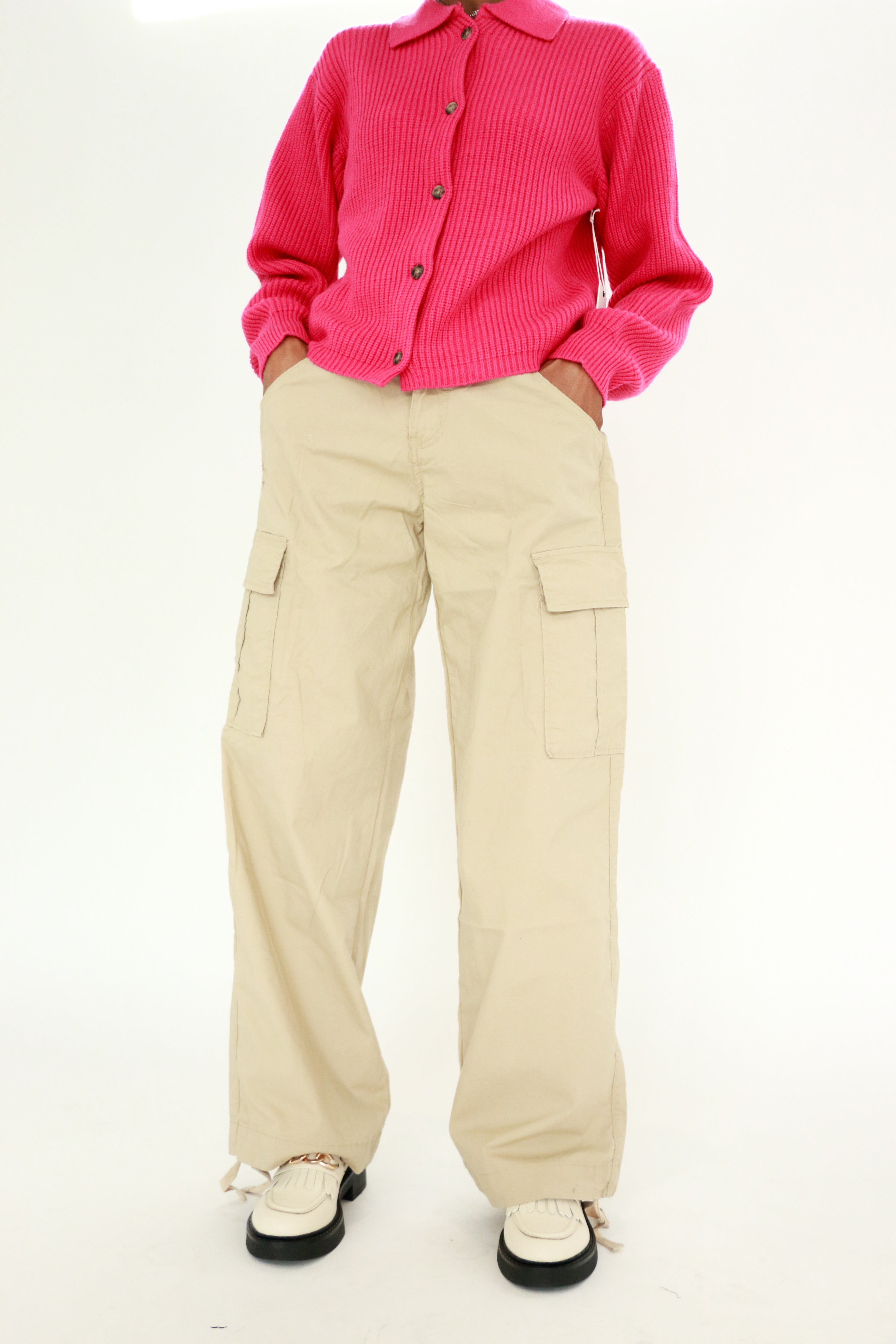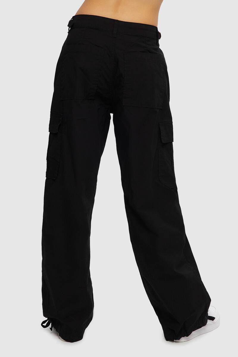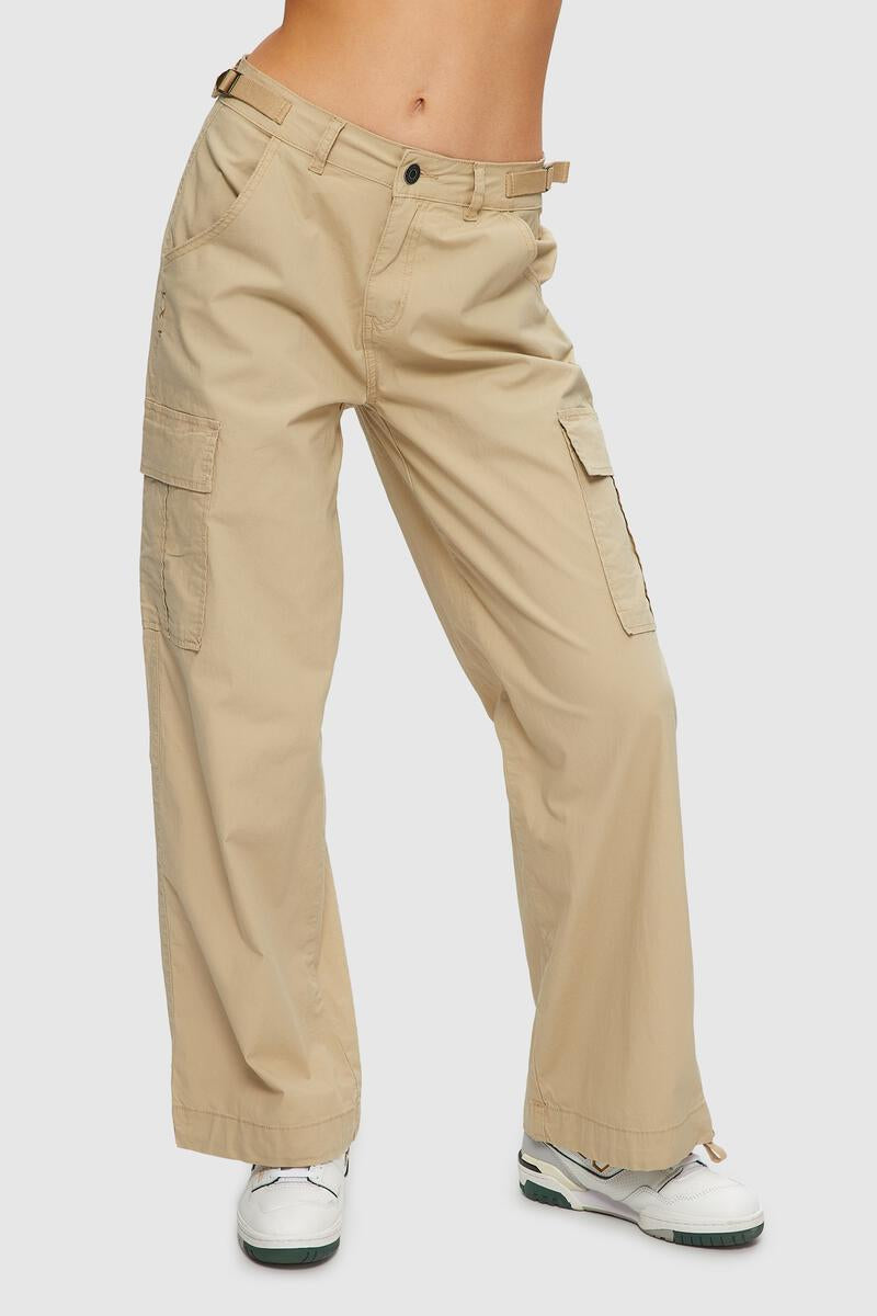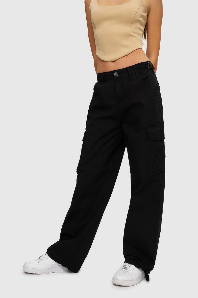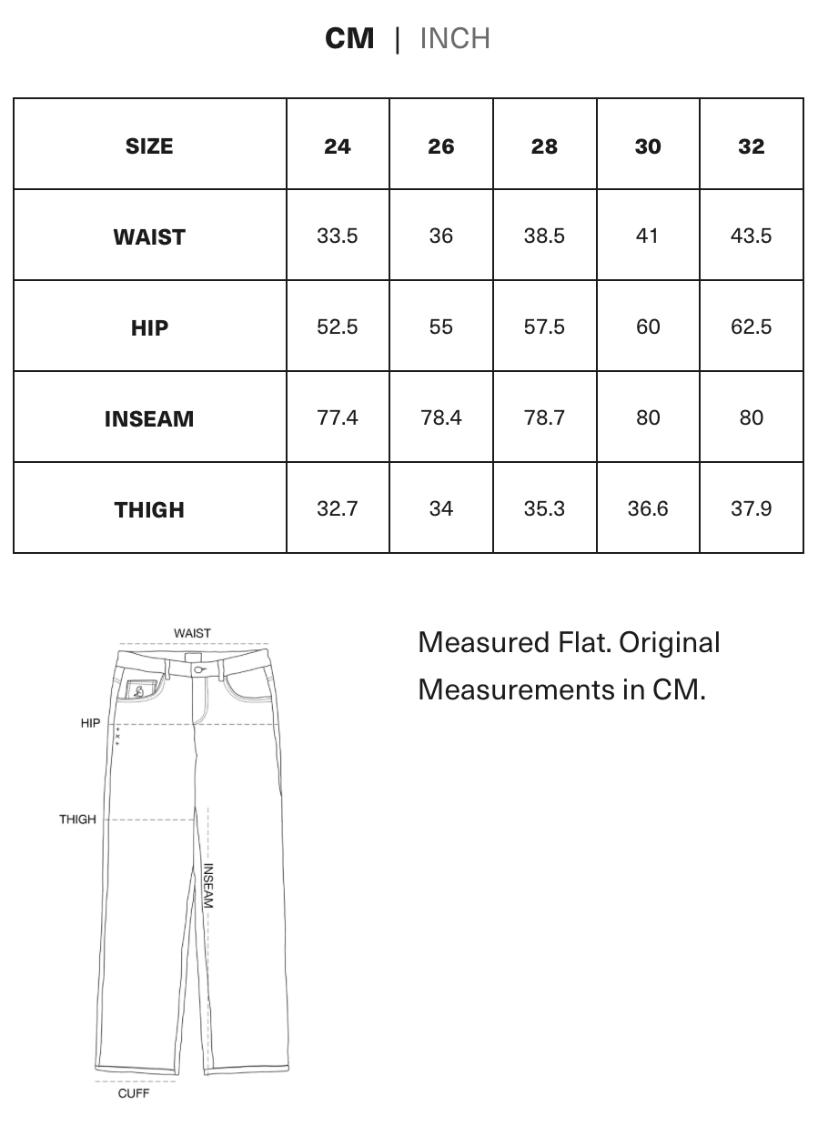 This modern 90’s style wide-leg pant features an adjustable waistband with built-in belt loops a zip fly. It has deep slash front pockets, as well as large rear patch pockets and flap leg pockets.