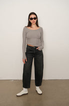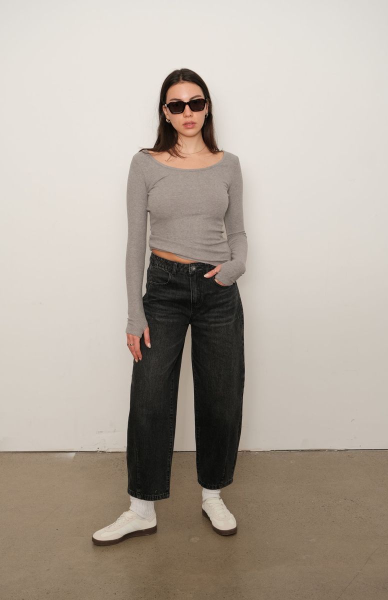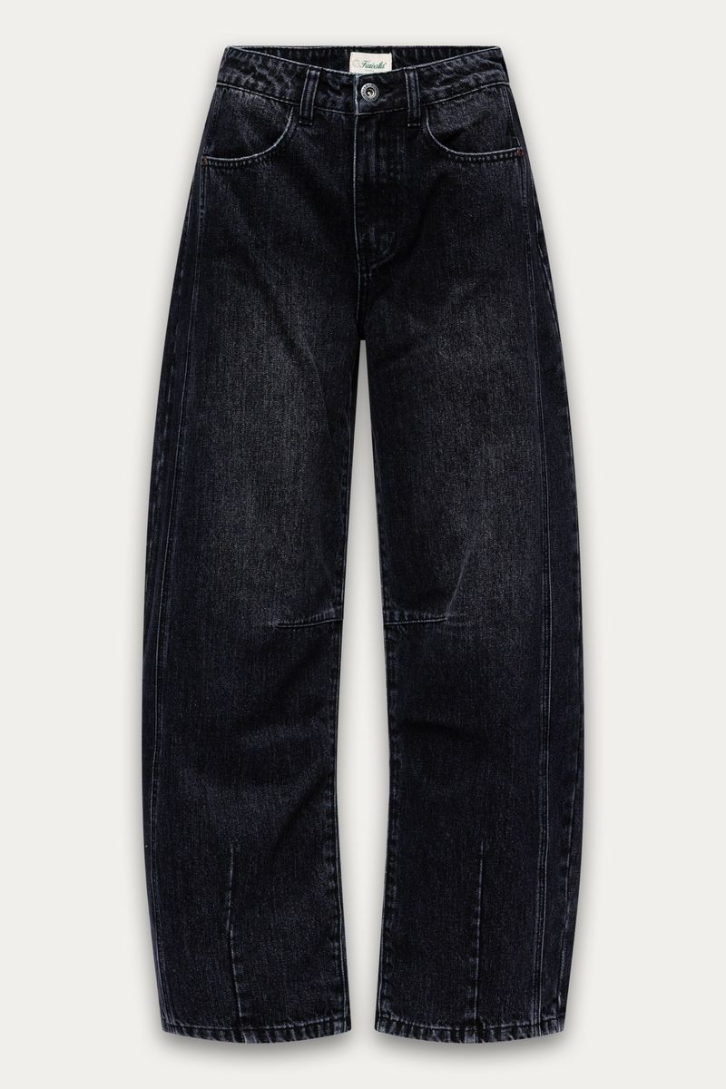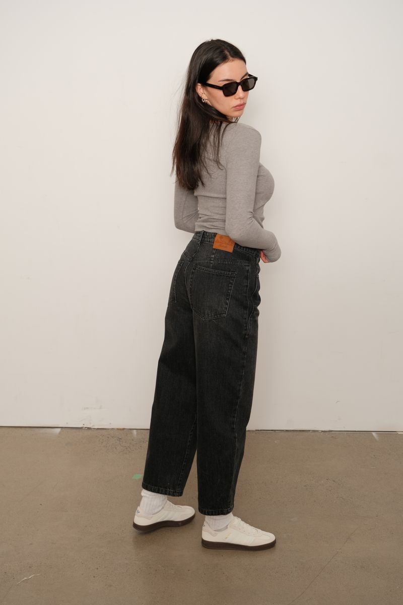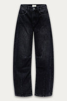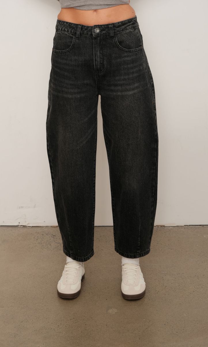 Barrel leg jeans, black wash colourway, zipper fly & single button closure, functional belt loops, as well as front and back pockets.