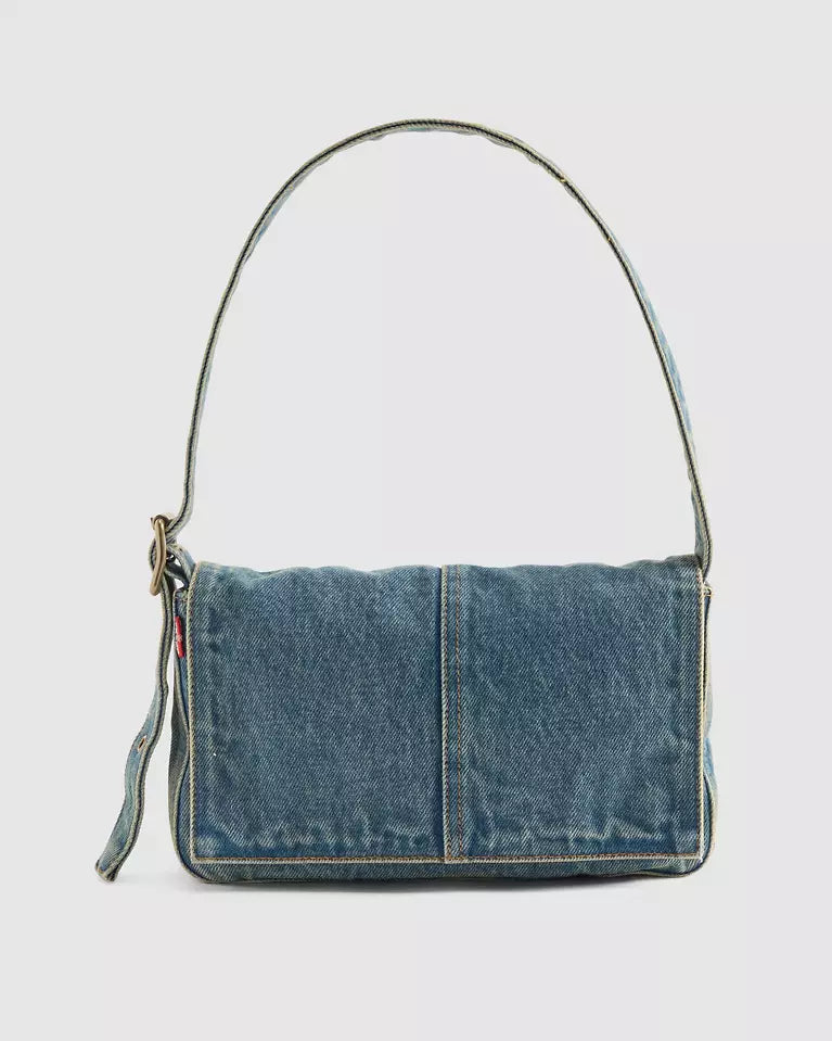 This vintage-inspired Brannan Shoulder Bag is made with denim and features a foldover design with a magnet closure and an adjustable strap.