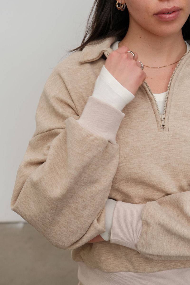 Quarter zip sweater with collar, thick plush fabric, full length, available in beige & chocolate brown colourways.