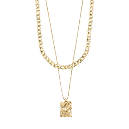 Super stylish with a sense of chic. This set is made up of a curb chain necklace and slender box chain necklace holding a hammered square pendant with one of a kind detailing.