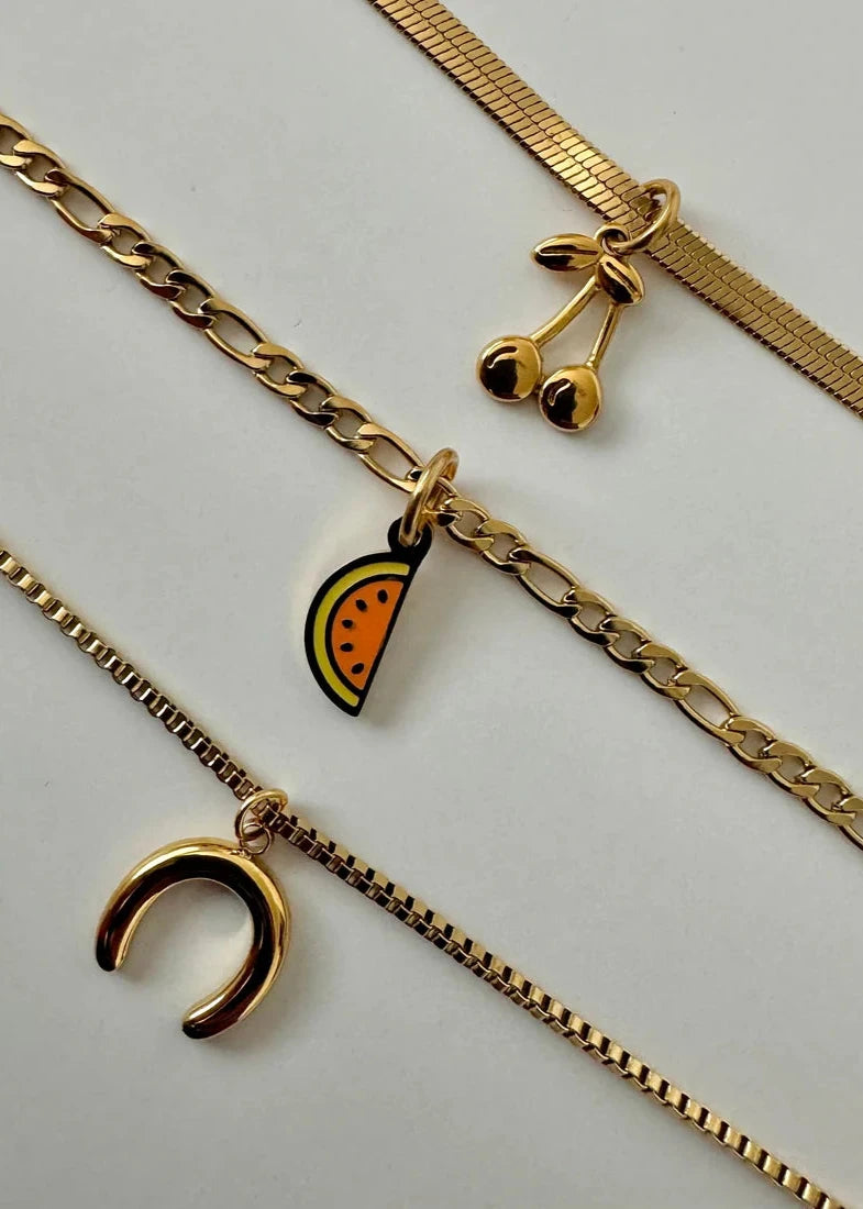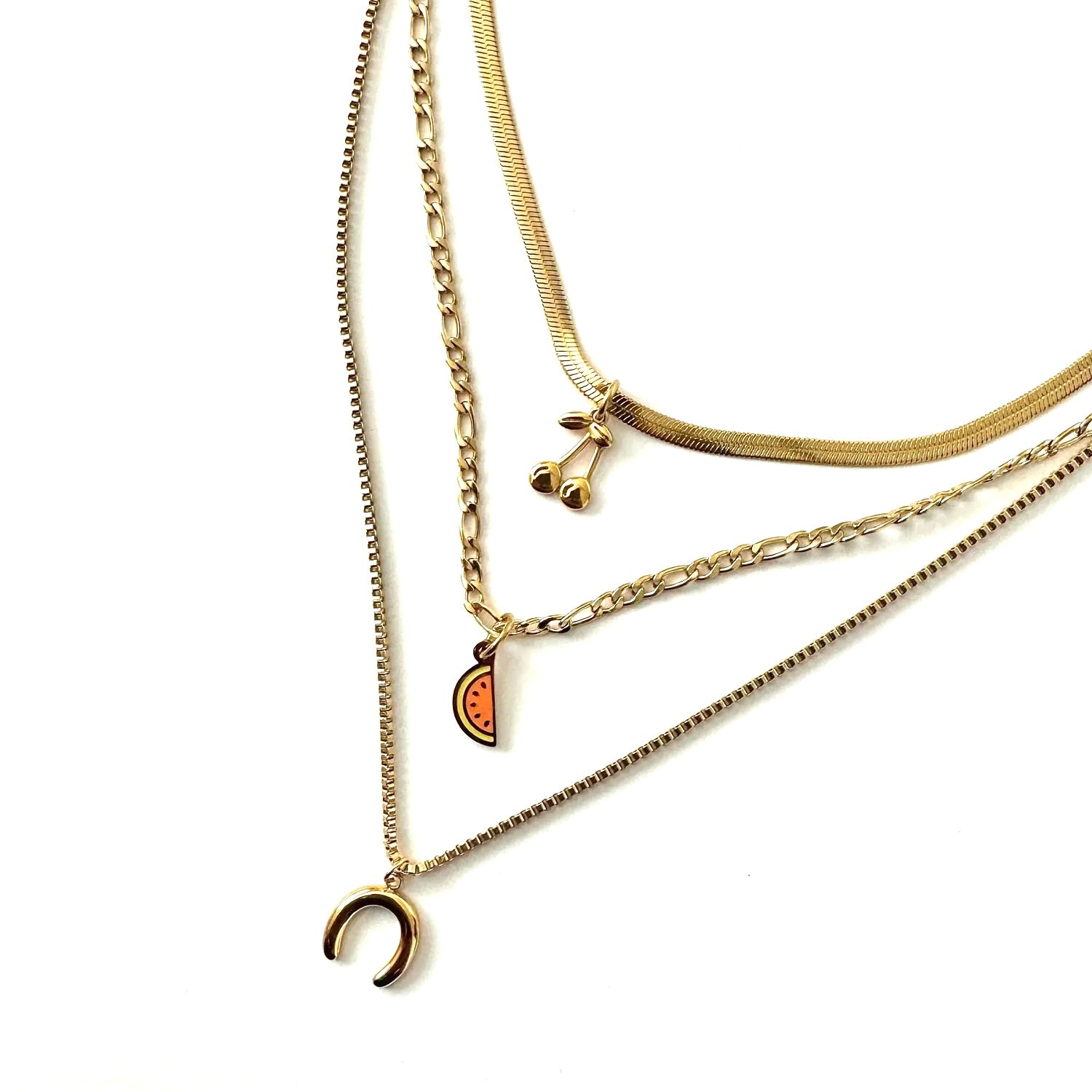 A three layer necklace with 3 charms for a statement. The charms include cherry, watermelon and horseshoe.