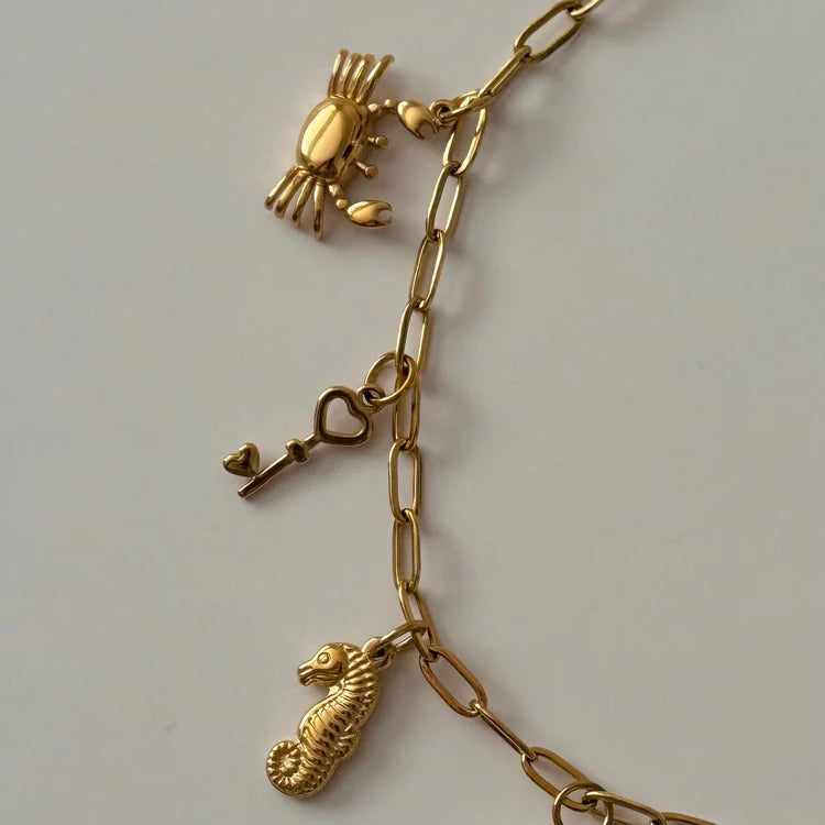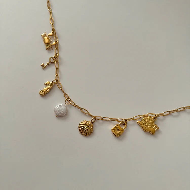 Indulge in the coastal charm of our 7-charm necklace, featuring crab, key, seahorse, pearl, seashell, lock, and snail.