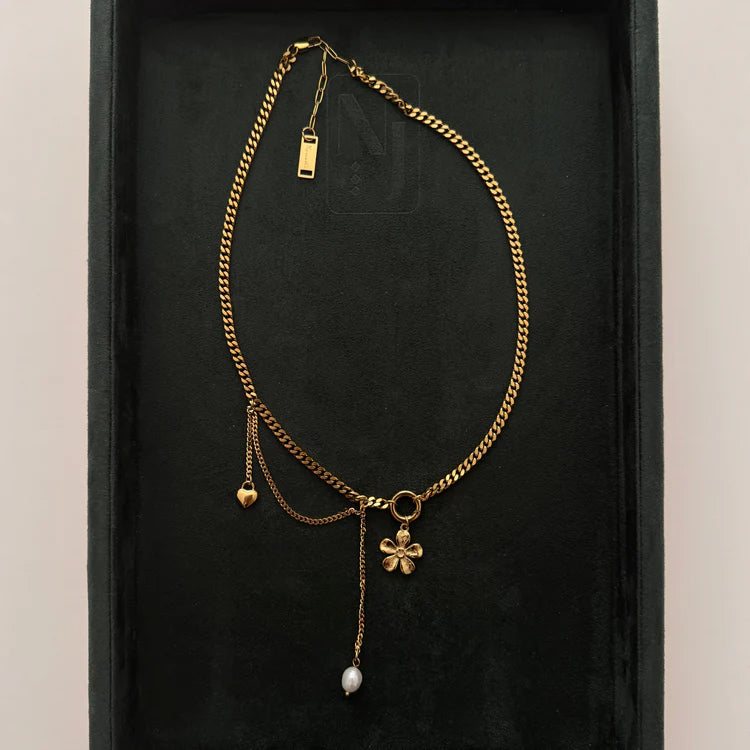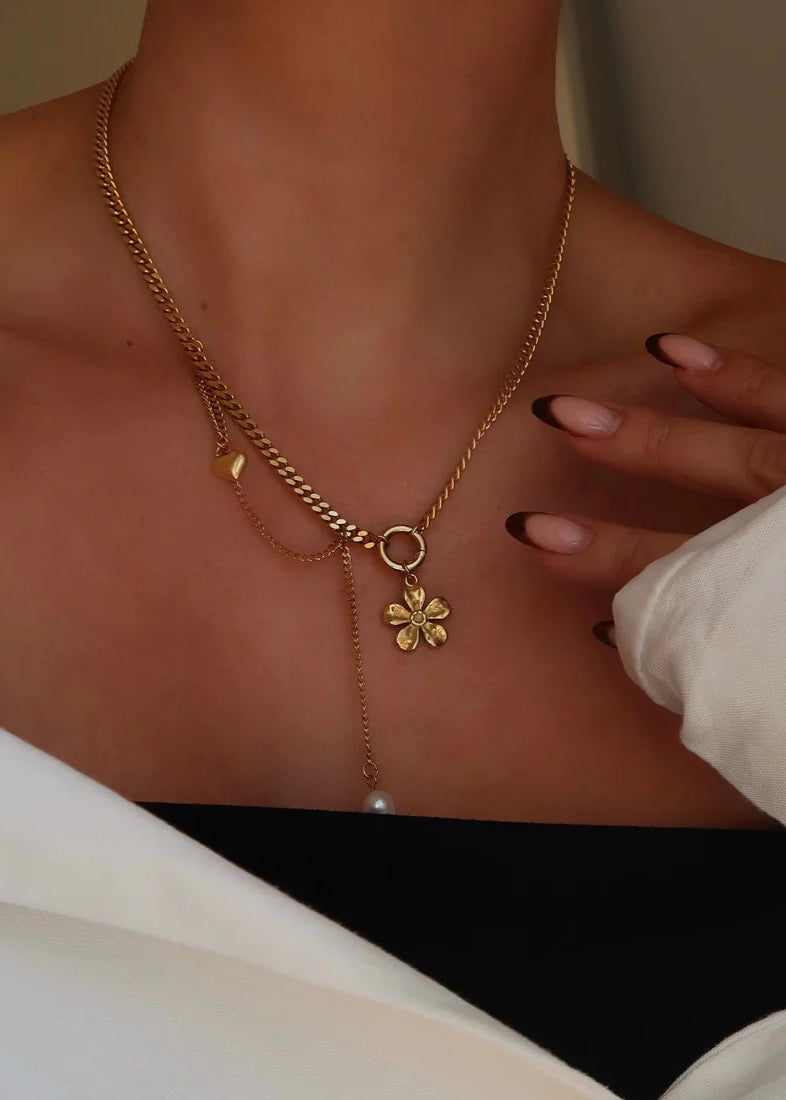 This elegant Willow Necklace showcases a stunning flower pendant, along with a charming heart and pearl charm drop, all delicately placed on a statement curb chain.