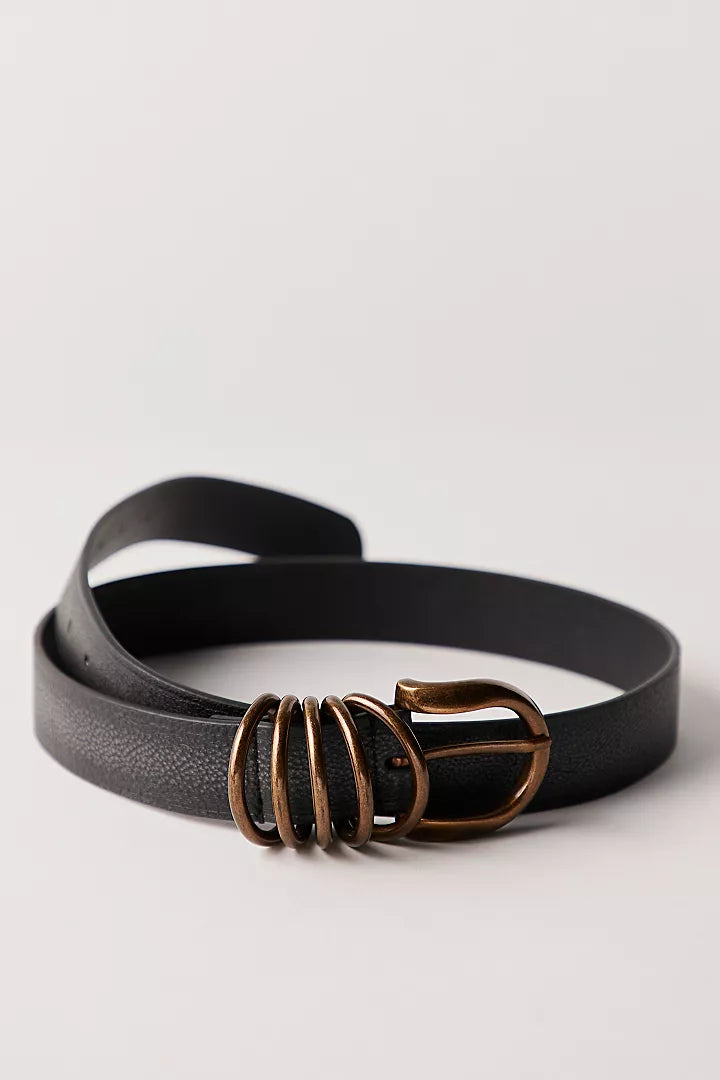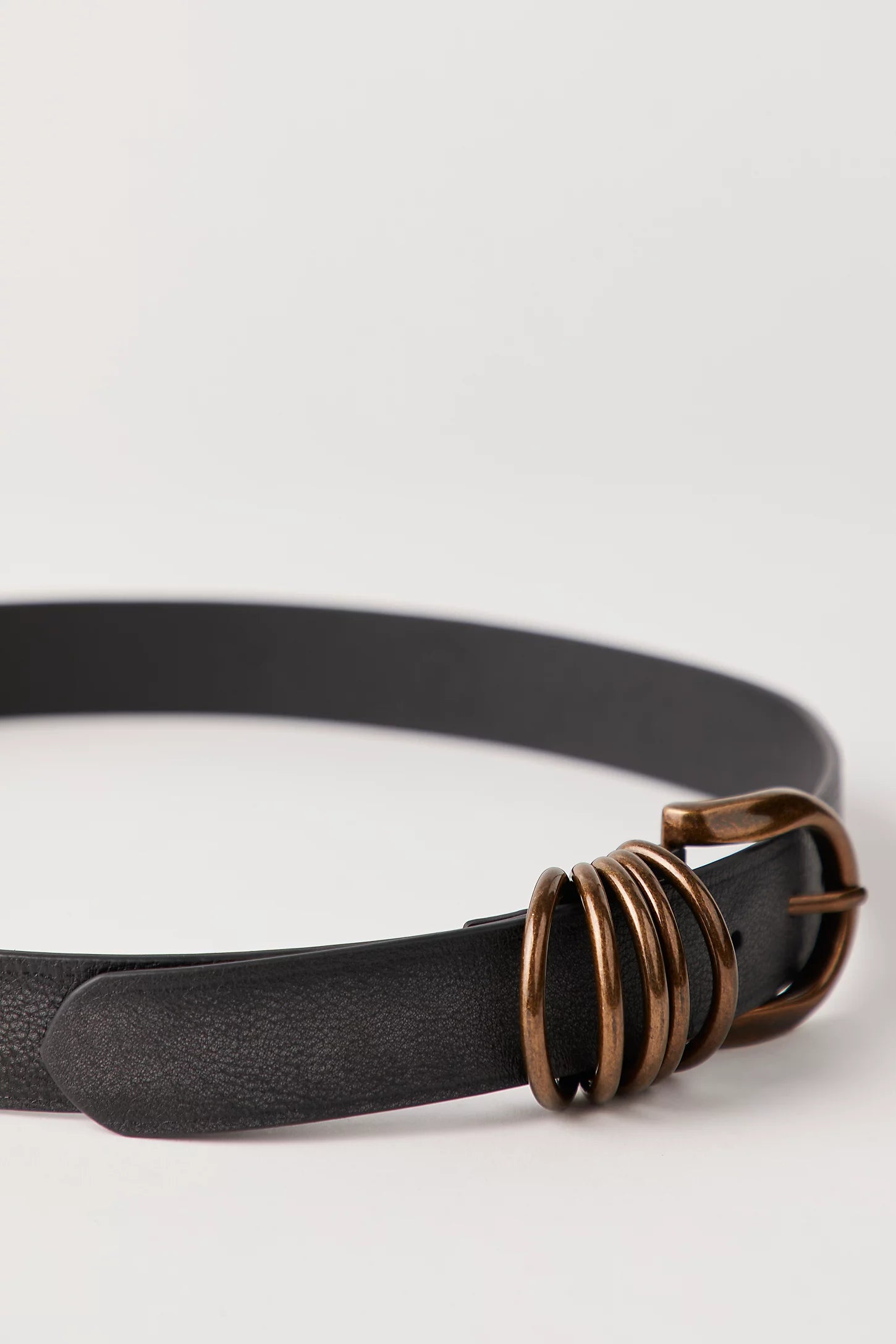 Pull things together in this classic leather belt featuring gold hardware with ring details on the side.