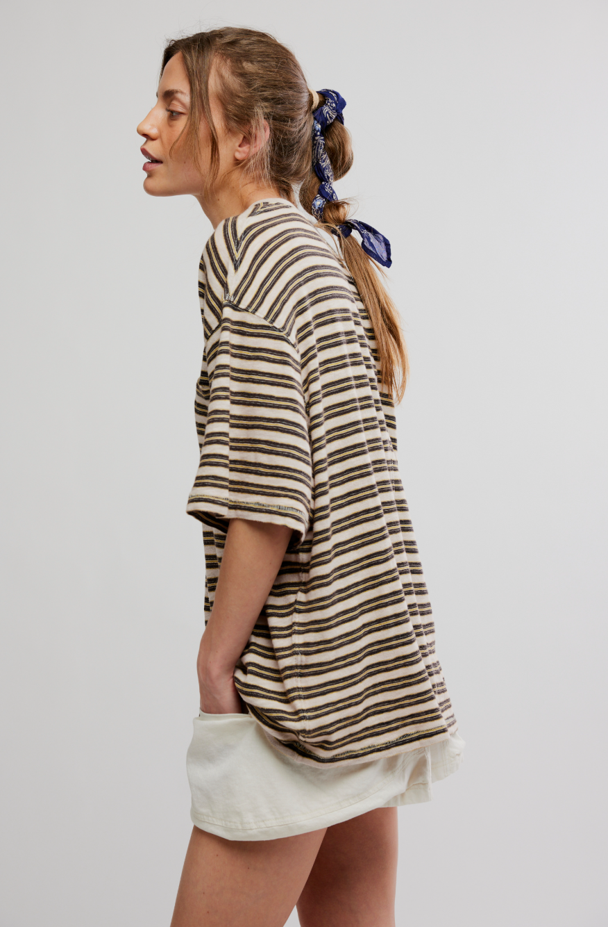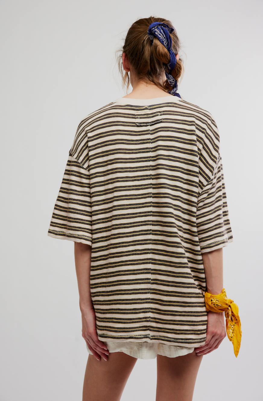 Introducing the All Love Stripe Pocket Tee. This is an oversized tee with a relaxed and comfortable fit.