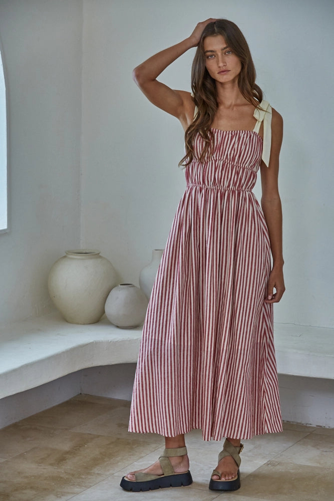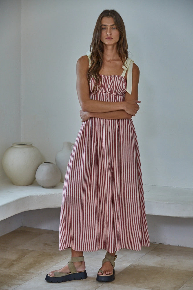 A new favourite in your spring and summer wardrobe, this lightweight striped midi dress is crafted from a breathable cotton-linen blend. It features shoulder tie straps and a soft cotton lining - perfect for easy, warm-weather styling.