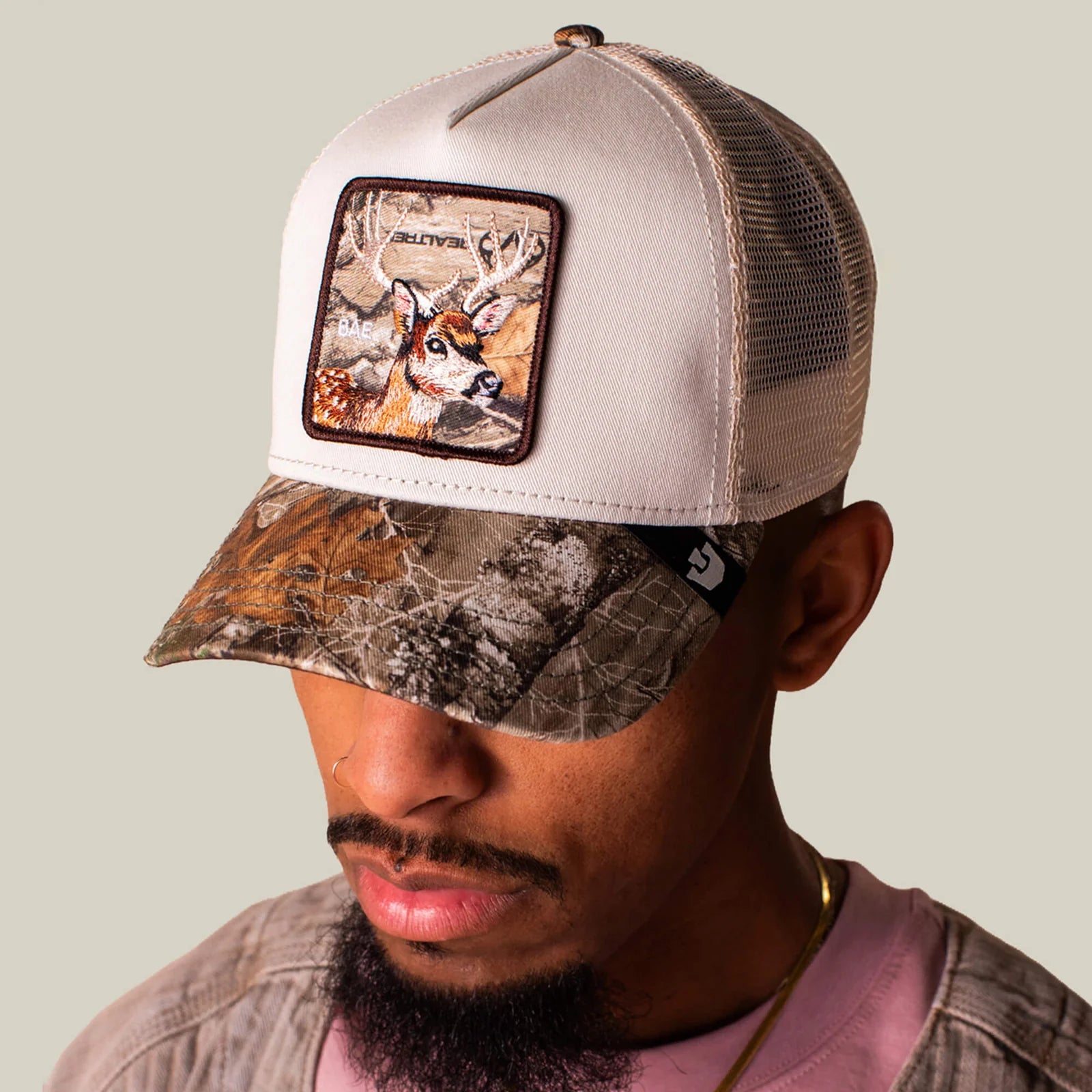 White front with Realtree Edge camo and a doe patch stamped BAE, soft eyes doing all the work. Sweet look, wild setting, dangerous levels of charm. Camo colorway contrast, deer patch affection, and proof that even in the woods, heartthrobs exist.