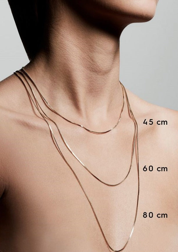Beautiful and simple box chain necklace, 45 cm long. Personalize it with our charms and pendants or simply layer it with your other Pilgrim necklaces.