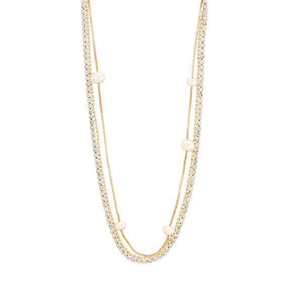 Shine bright! Pilgrim's STARLIGHT 3-in-1 necklace is the perfect accessory to capture the summer's romantic vibe. A gold-plated piece that combines a slim box chain with genuine freshwater pearls, an elegant bead chain, and a crystal chain adorned with sparkling Preciosa crystals for a sweet layered effect. Pair it with a flowy summer dress or a simple tank top to create a dreamy look imbued with sweet summer vibes. The chain measures 38 cm + 9 cm extension chain.