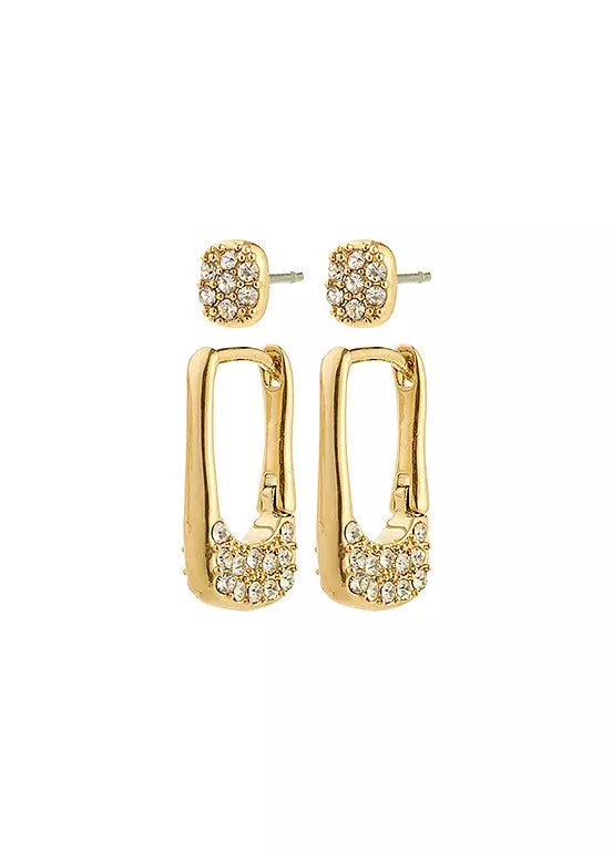 Seize the moment, shine forever! With the two sets of earrings from Pilgrim’s INSTANT collection, you get a unique ear - stacking look with a twist. The small stud earrings and oval hoops in a safety pin inspired design are decorated with shiny Preciosa crystals, giving your look a cool combo of glam and urban vibes. easy-to-use click clasps make them easy to wear and perfect for your everyday outfits â mix and match for a personal touch. Made from 97% recycled material.