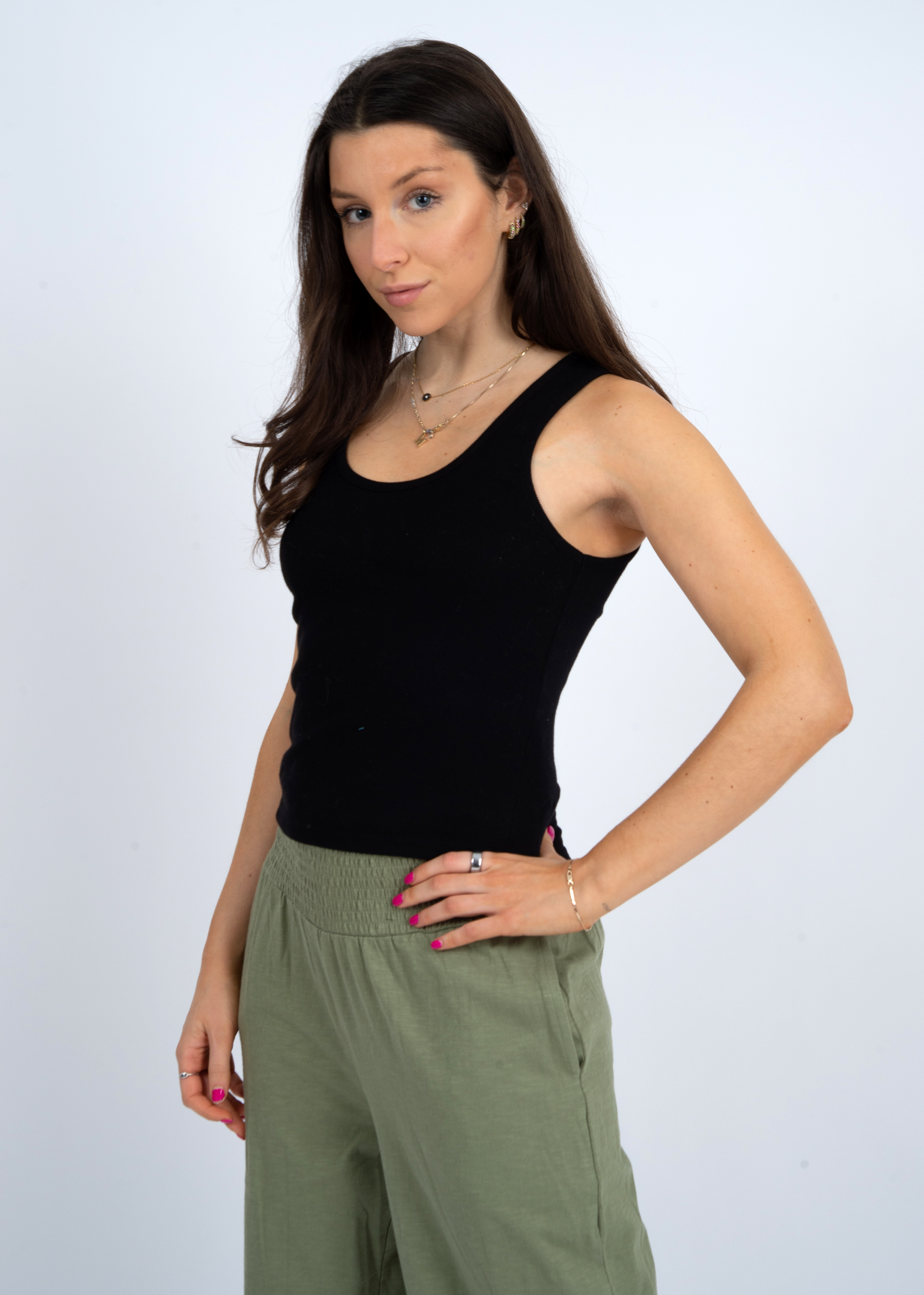 Details: Black tank, ribbed material, scoop neckline.
