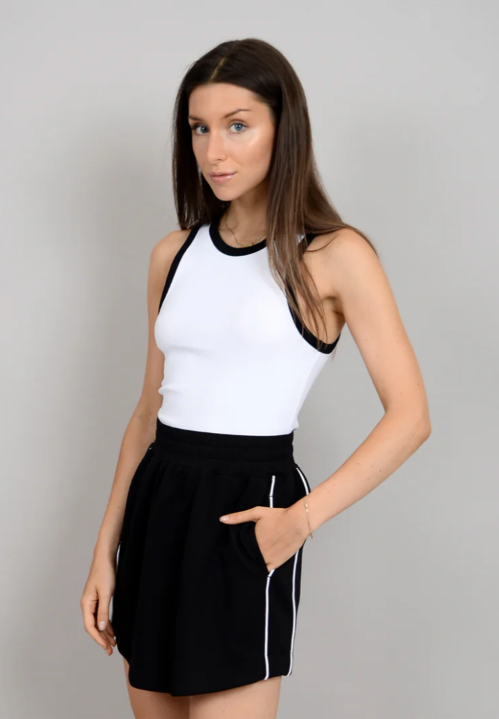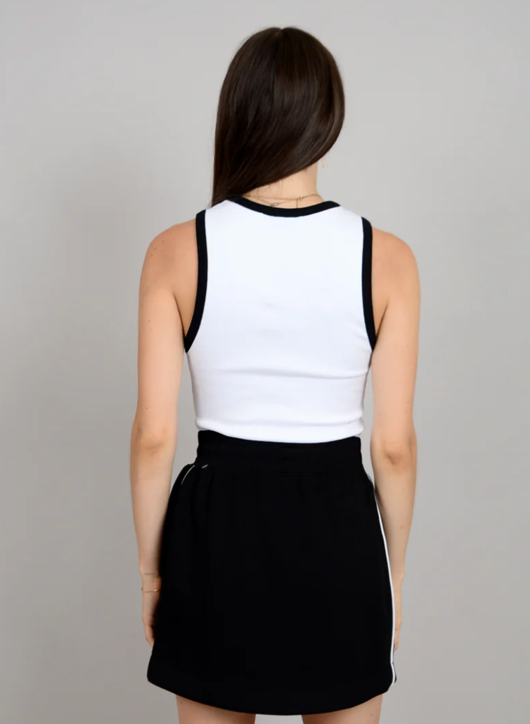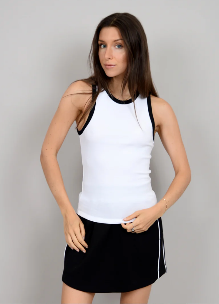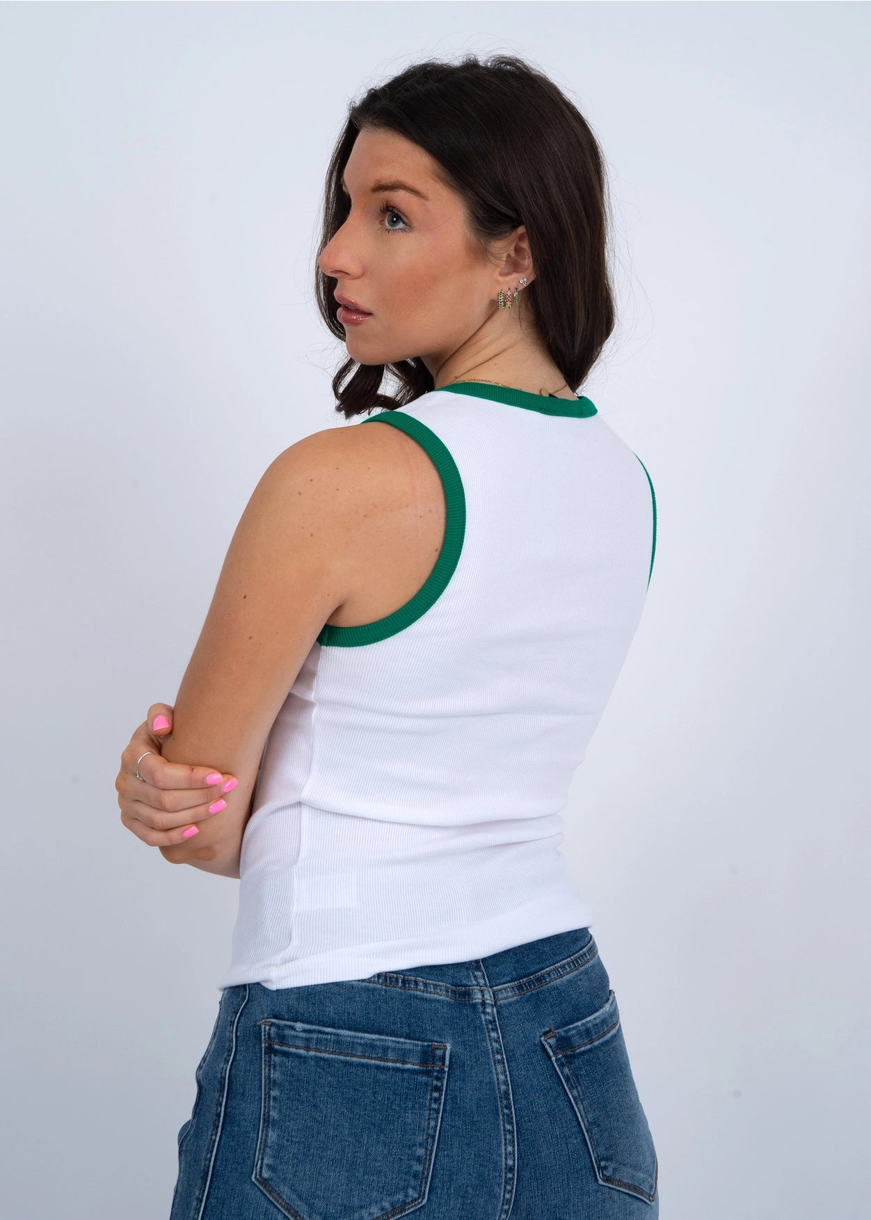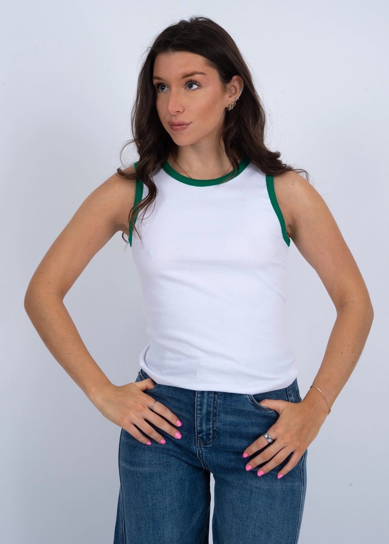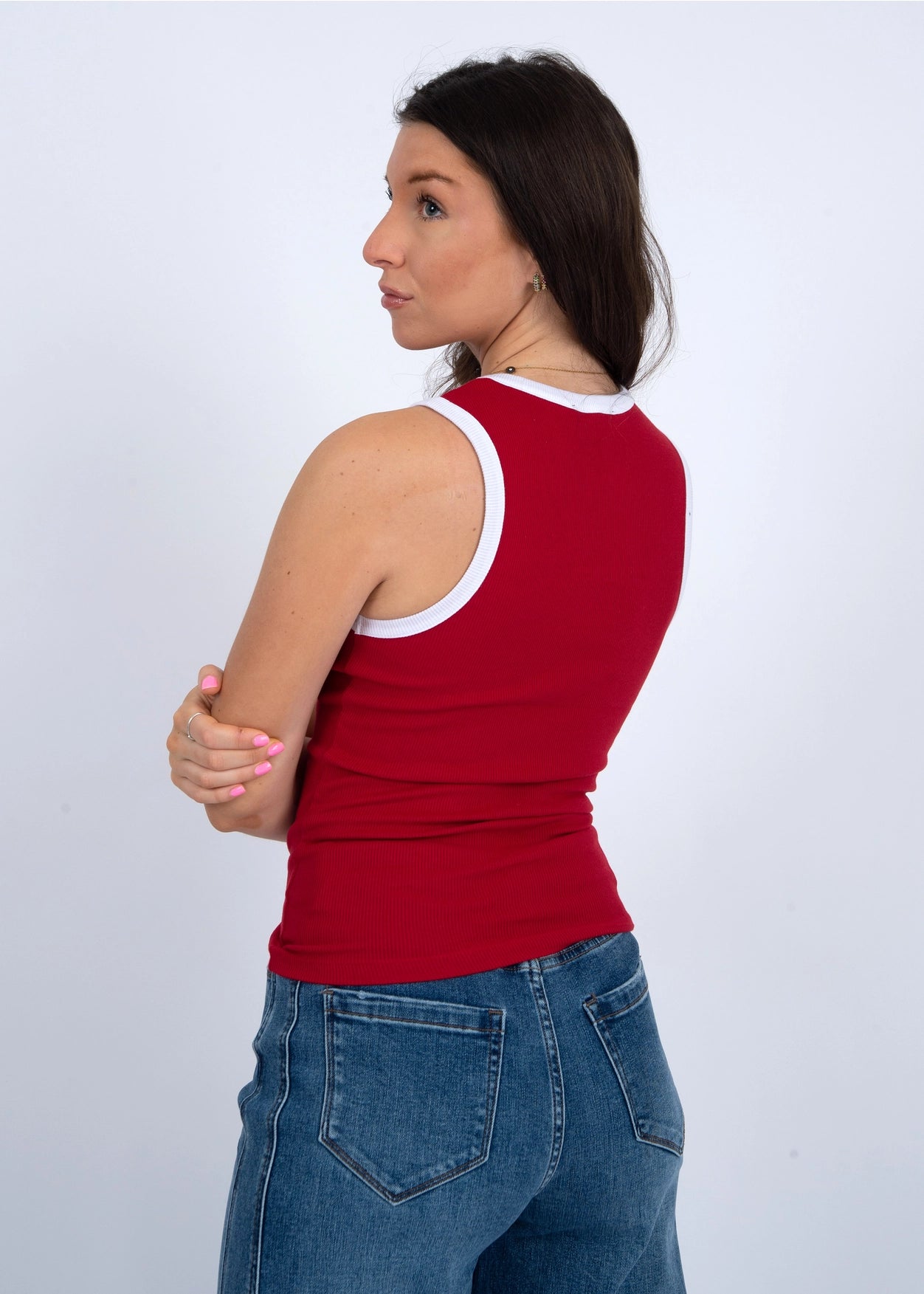 Details: Tank with a high crew neckline, white border around sleeve and neckline, red color, ribbed fabric.
