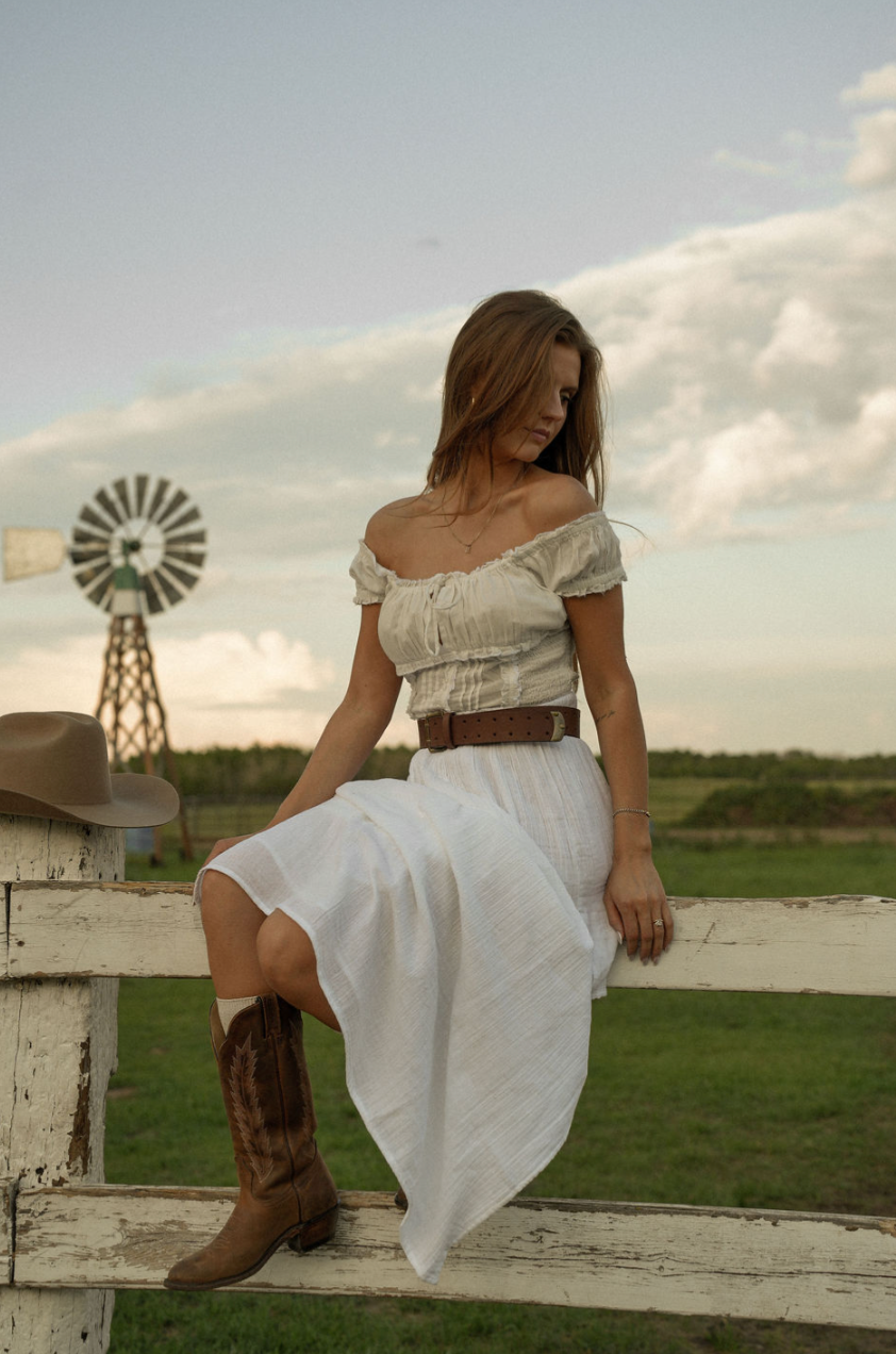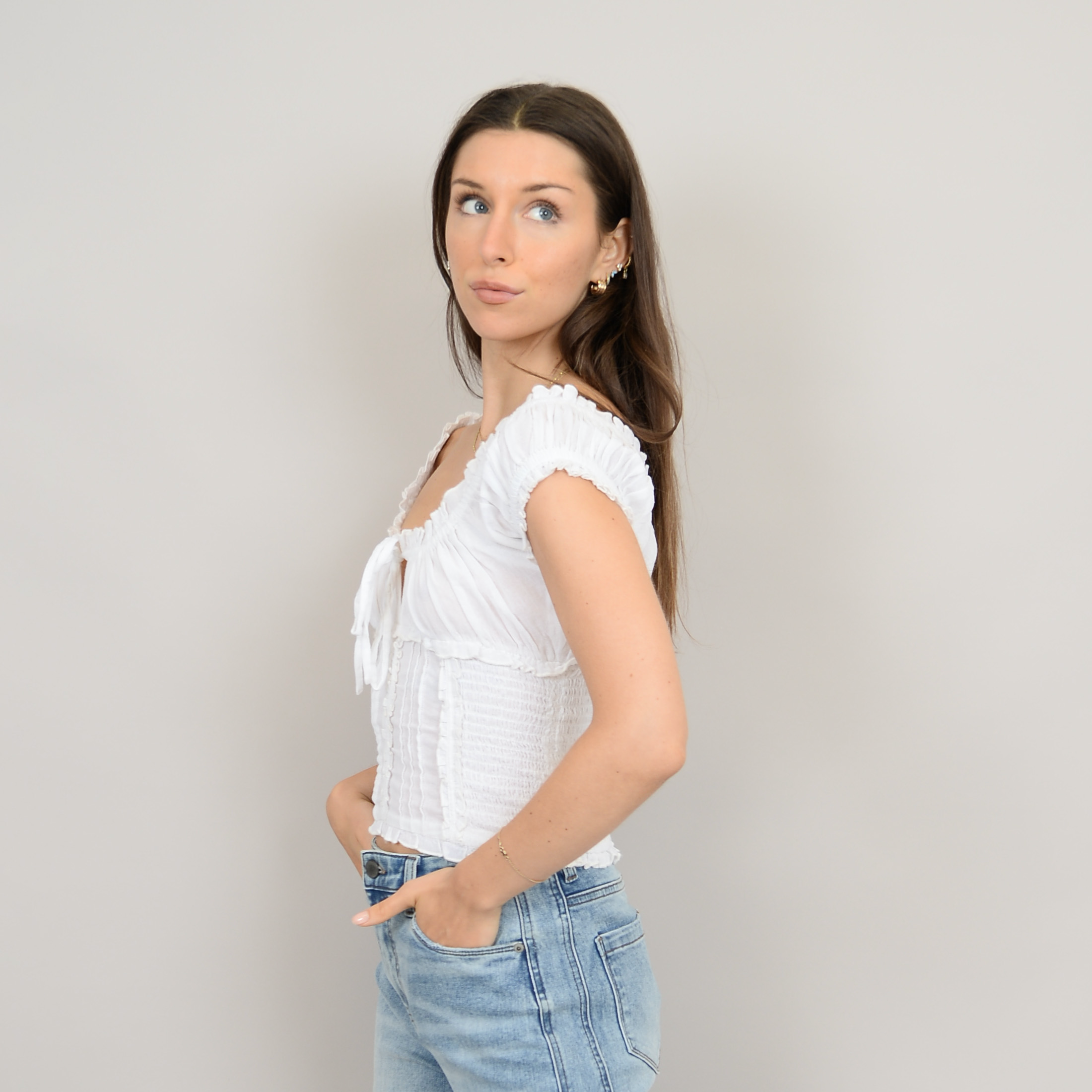 Details: Black or white top, puff cap sleeves, tie on chest, ruffles along seams, elastic back, semi shear faux corset bottom