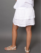 Details: White short skirt, gauze and layered fabric, elastic waistband, lace detailing throughout tiers.