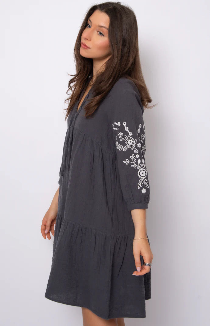 Details: Gauze fabric, midi dress, charcoal colour, lace embroidery on sleeves, tie on chest, v-neckline, tiered bottom, 3/4 sleeve