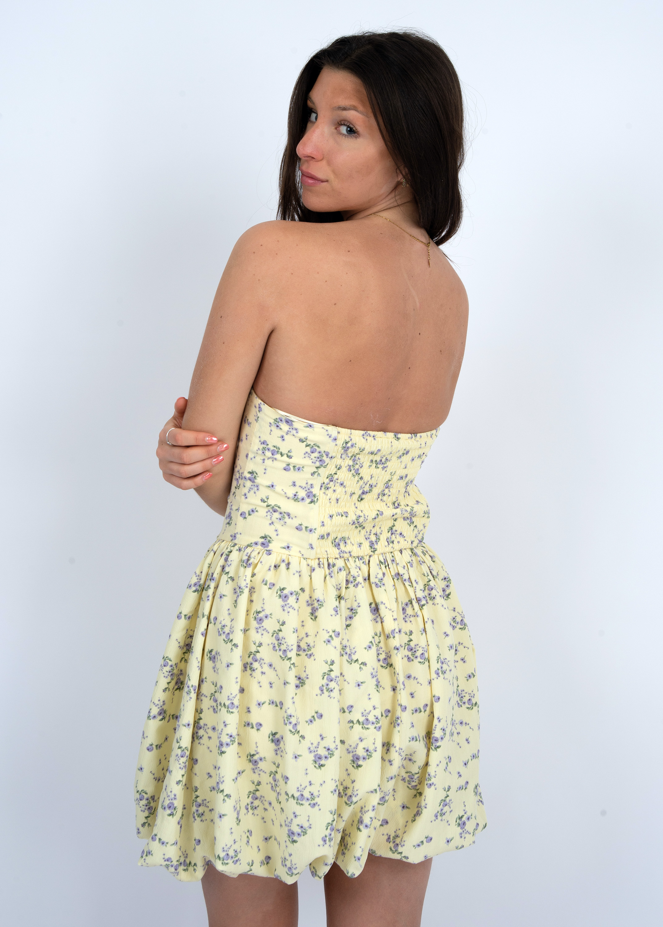 This yellow floral dress is perfect for warm, sunny days. It’s short and flirty with a fun, flowy skirt that moves with you. The top is strapless with a bustier-style fit that gives shape and support, making it both cute and comfy. Covered in soft, floral prints, it’s a sweet and stylish choice for brunch, parties, or a day out.
