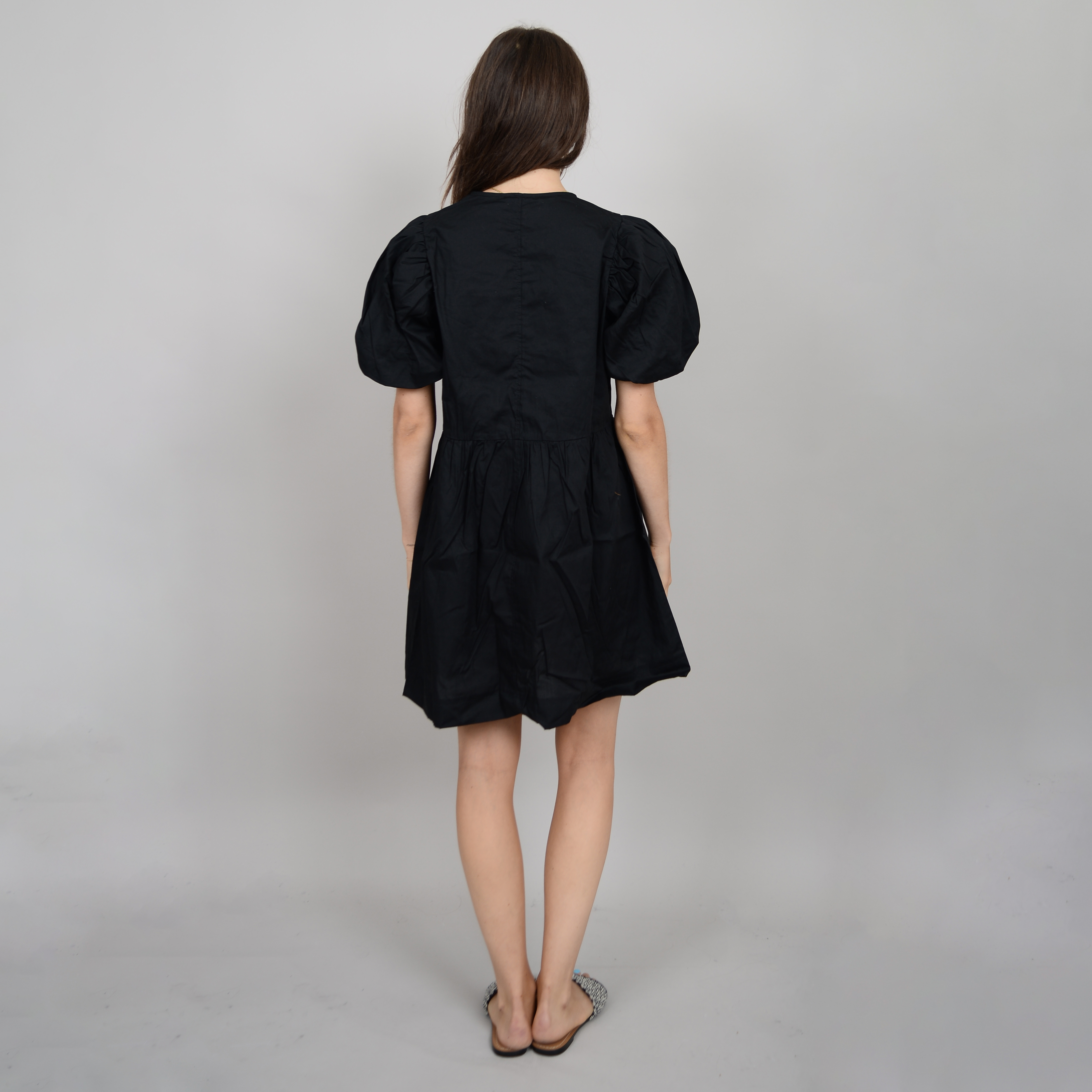 Details: Black, baby doll style, midi dress, bow details on front with buttons underneath, puff sleeves with elastics, seams vertical on top of dress.