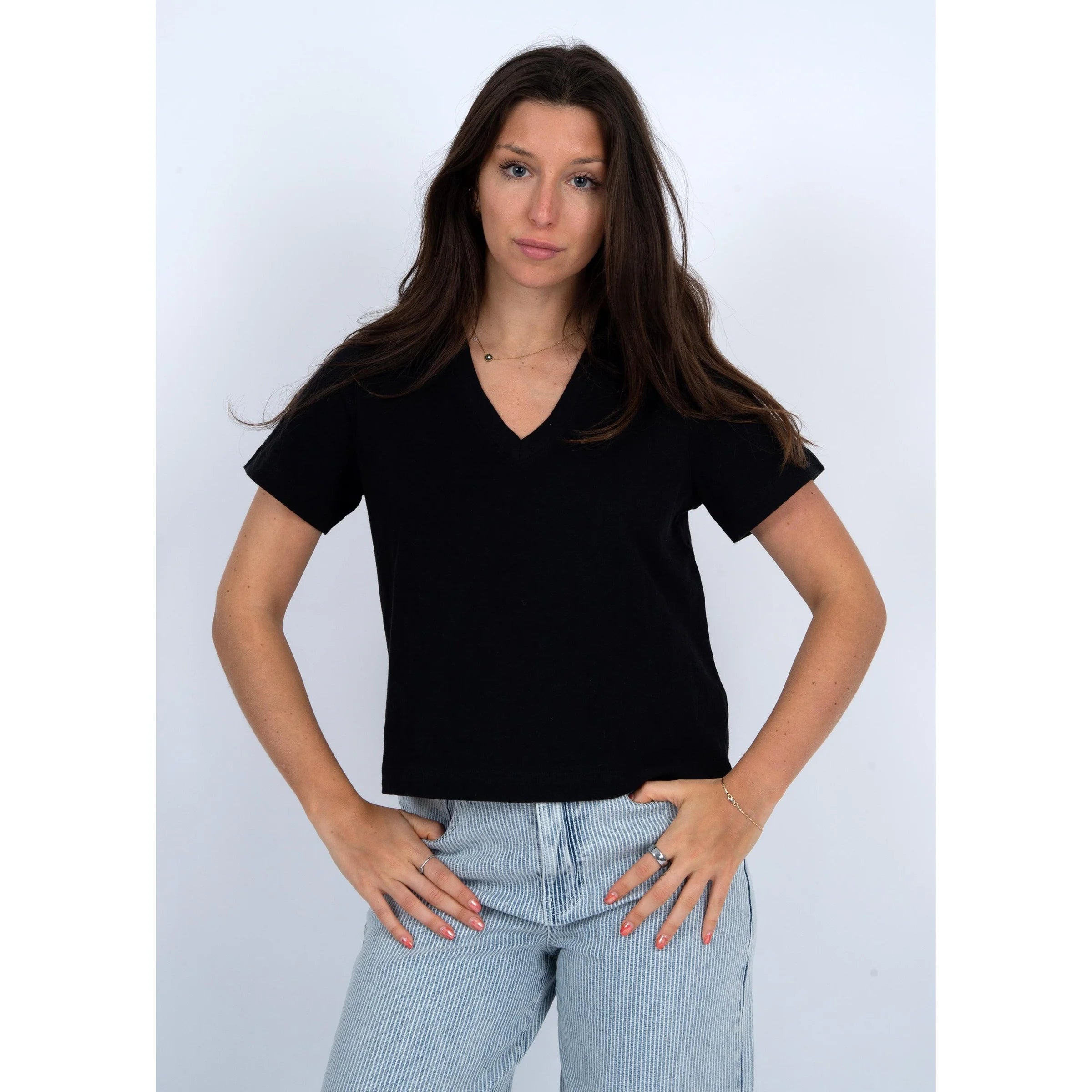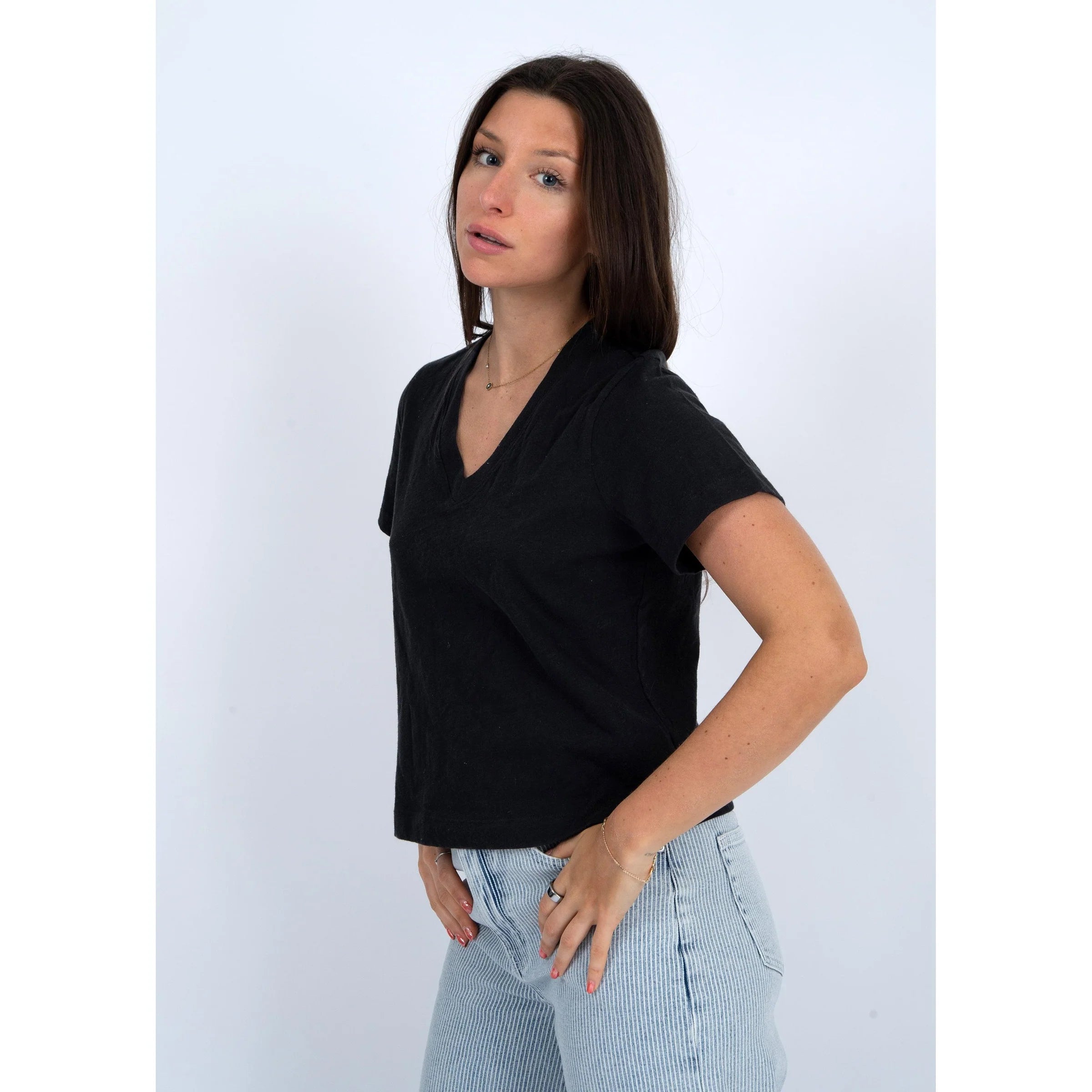 Details: The Vera V-Neck Tee in black offers a lightweight and breathable design, making it an essential basic for your spring and summer wardrobe. Its simple yet flattering V-neck cut ensures comfort and style, perfect for warm days when you want to stay cool without sacrificing elegance. This versatile tee pairs effortlessly with any outfit, providing a fresh, easygoing look for everyday wear.